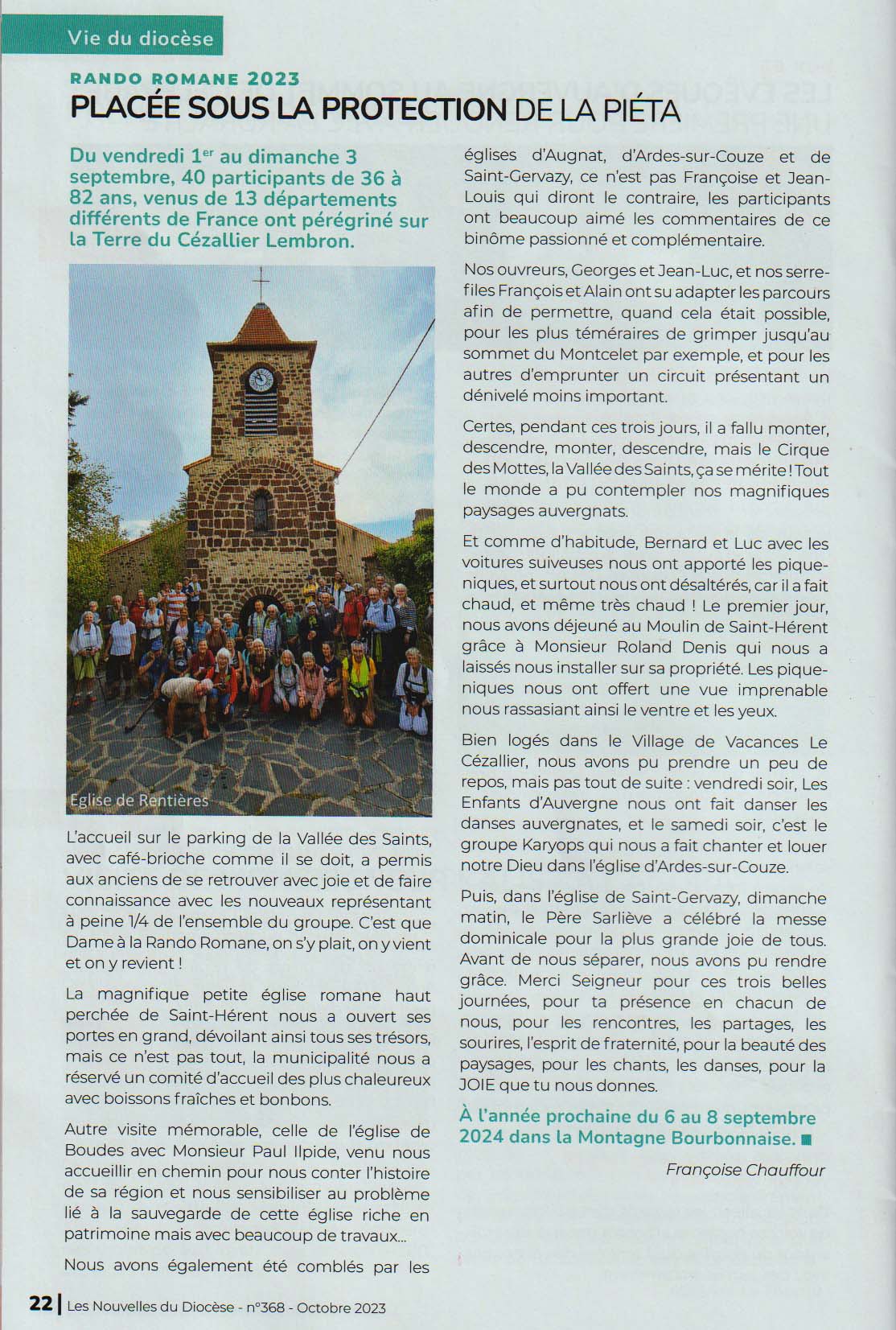 Pèlerine, sandales et besace ont été remplacées par une cape imperméable, des chaussures confortables et un sac à dos fonctionnel ... Mais les nouveaux pèlerins suivent fidèlement les ancêtres qui ont tracé la route. Au XIIe siècle, les échanges étaient déjà nombreux : pèlerins, marchands, croisés rapportèrent de leurs voyages des idées de décors et de techniques que les artistes locaux accommodèrent ensuite à leur propre besoin. Ces influences byzantines, mozarabes se retrouvent sur chacune des églises romanes d‛Auvergne où s‛entremêlent les formes et les couleurs qui se jouent de l‛arkose et de la pierre volcanique. L‛Auvergne recèle quelque 240 églises romanes chargées d‛Histoire et de beauté. Qui sommes-nous ? Une équipe de 9 organisateurs qui nous retrouvons régulièrement pour offrir un programme renouvelé chaque année. Comment est née la Rando Romane ? Suite à l’expérience du Tro-Breiz en Bretagne, l’idée est venue de proposer quelque chose en Auvergne reprenant le même esprit, mais seulement sur 3 jours et avec 40 participants, nous ne sommes donc pas plus de 50 personnes en tout. Que proposons-nous ? Chaque année, un territoire à découvrir en Auvergne. La Rando Romane ? C’est 3 jours de randonnée à vivre avec un esprit à la fois sportif, culturel, spirituel, convivial et festif. La Rando Romane propose à des personnes venues d’horizons différents, d’âges variés et de conditions physiques inégales, de se rassembler, de cheminer et de franchir le seuil d’églises.Rencontres, échanges, émerveillement devant la beauté de la nature, devant le riche patrimoine laissé par nos ancêtres nous transmettant ainsi leur Foi. LES EDITIONS Rando Romane 2025 / 5-7 Septembre / Affiche / Compte-rendu Rando Romane 2024 / 6-8 Septembre / Compte-rendu / article / reportage Rando Romane 2023 / 1°-3 Septembre / Affiche / diaporama / Compte-rendu / article Rando Romane 2022 / 2-4 Septembre / Compte-rendu / article Rando Romane 2021 / 27-29 Août / Compte-rendu / article Rando Romane 2020 / 21-23 Août / Compte-rendu / article Rando Romane 2019 / 23-25 Août / Compte-rendu / article Rando Romane 2018 / 31 Août - 2 Septembre / Compte-rendu Rando Romane 2017 / 25-27 Août / Compte-rendu / article Rando Romane 2016 / 26-28 Août / Compte-rendu Rando Romane 2015 / Rando Romane 2014 / Rando Romane 2013 / 23-25 Août / Compte-rendu Rando Romane 2012 / 24-26 Août / Affiche / annonce / diaporama / article contact : randoromane63@laposte.net / 06 80 52 05 01 ou 06 24 01 28 25 |