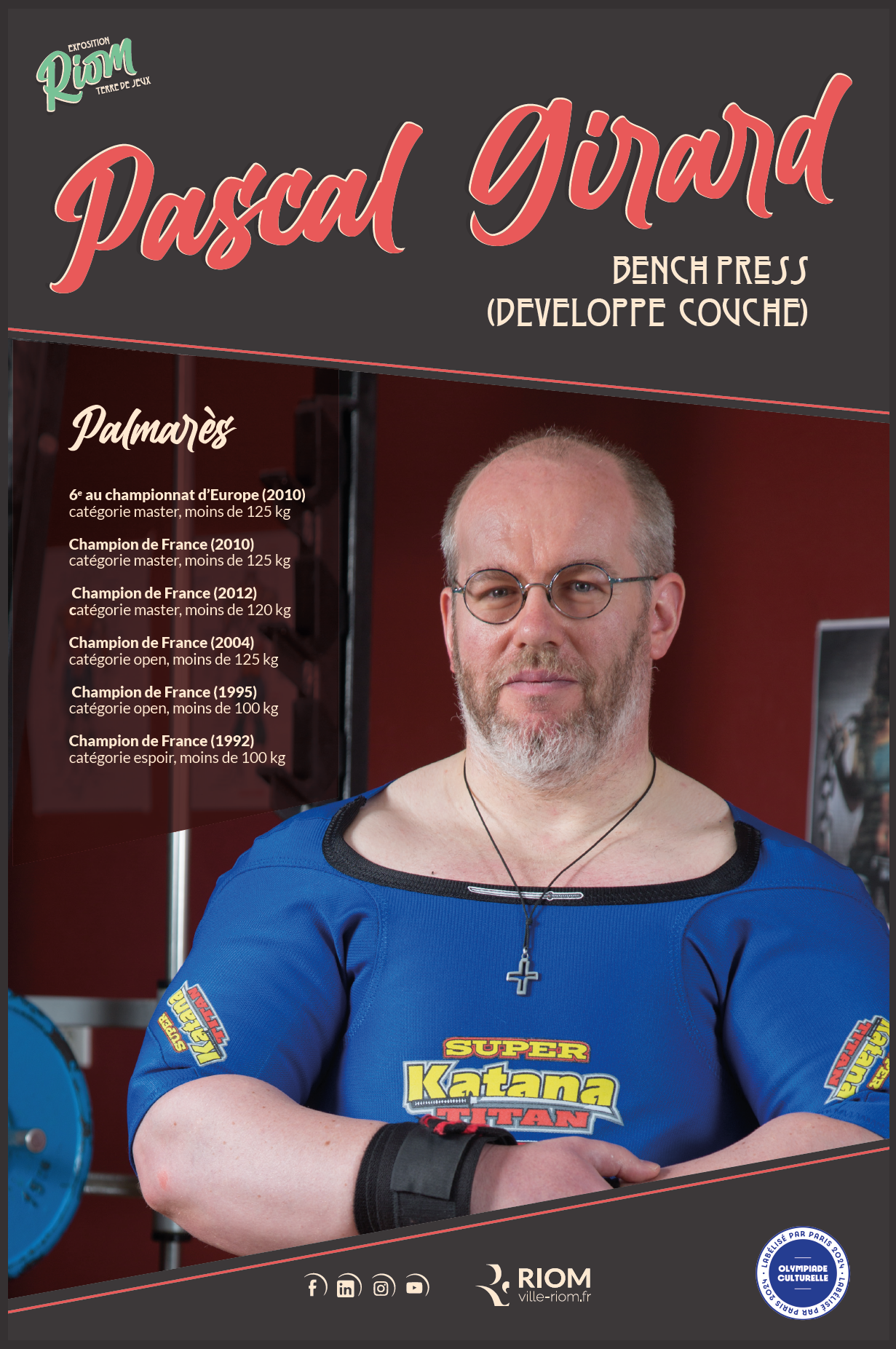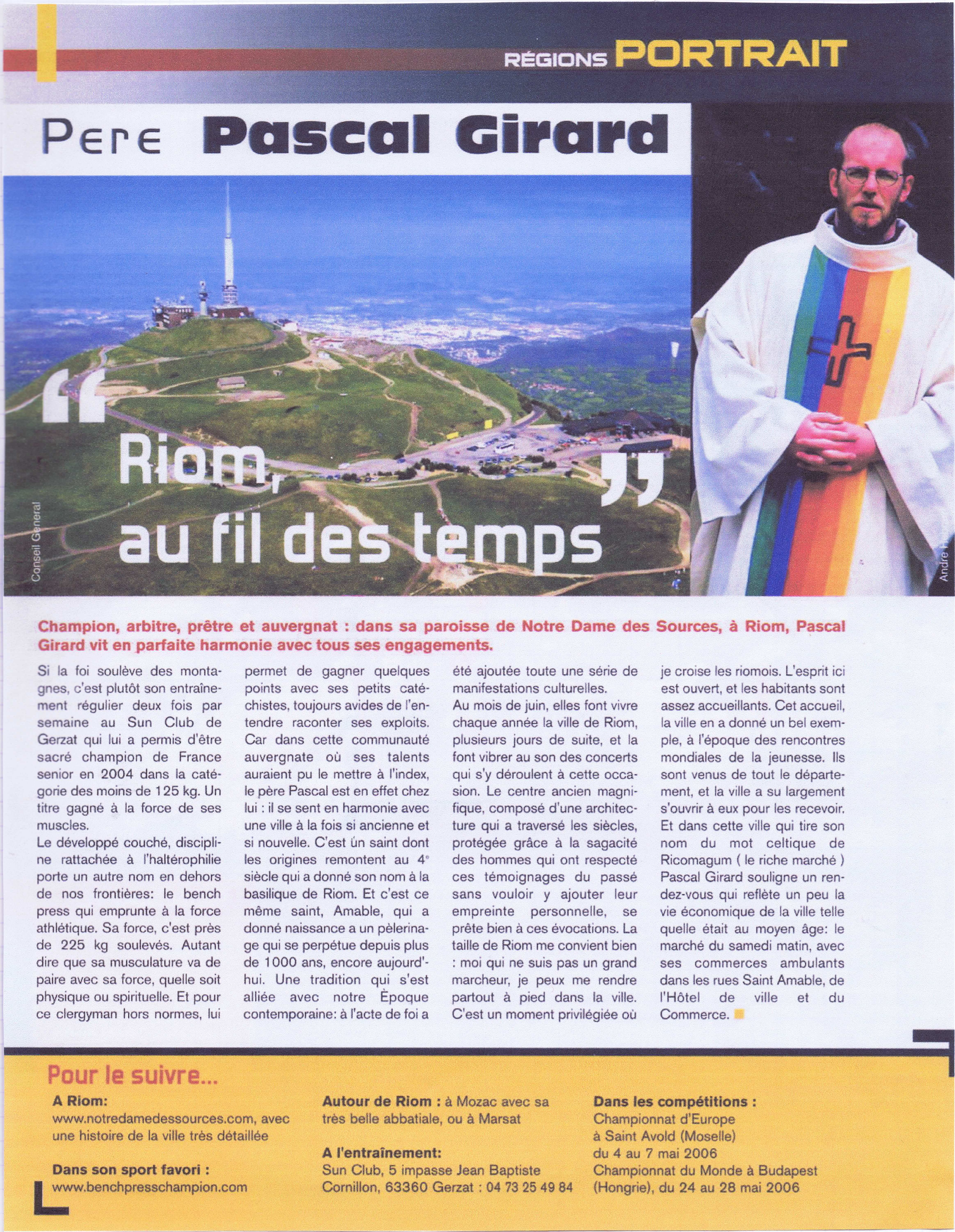 Une exposition des grands sportifs et évènements de Riom : 27 Juin 2024 RIOM, TERRE DE JEUX ! : article - vidéo Une exposition avec les portraits dans la ville de champions riomois dont le père Pascal Girard ... Nouvel article sur un site internet ... CLERMONT-FERRAND : LA FORCE ET L'ESPRIT DES JEUX Site internet de la conférence des évêques de France du 15 Février 2024 ! Article de Florence de Maistre dans le cadres des Jeux de Paris 2024 ... Nouvel article sur un site internet ... DES CHANSONS POUR TRANSFORMER L'ESSAI Sur le site d'au cabaret du bon Dieu du 12 Février 2024 ! Réponse du père Pascal Girard au questionnaire de Robert Migliorini ... Membre de l'équipe de rédaction d'un livre ... EGLISE ET SPORT Numéro de la revue "Documents Episcopat" ... Mai 2022 ! Equipe de rédaction : Alain Paillard, Gilles Lecocq, père Pascal Girard et Pascal Balmand ... Couverture et article dans l'hebdomadaire du Semeur Hebdo : ... PASCAL GIRARD : PRETRE ET SPORTIF Journal : LE SEMEUR HEBDO, Rubrique : l'invité ... 13 Mai 2016 ! Mohammed Afiri, journaliste du Semeur m'interviewe sur mon parcours ... Reportage photos sur les prêtres et le sport : ... PRETRES ET SPORTIFS Site internet : dominiquedelpoux.fr/pretres-sportifs ... Juin 2014 ! Le photographe Dominique Delpoux me recontre pour faire un portrait photos du sportif et du prêtre ... Nouvel article d'un hebdomadaire chrétien : ... LE SPORT, TERRAIN D'EVANGELISATION POUR L'EGLISE Journal : LA CROIX : rubrique : religion ... 2 Mai 2013 ! Page de présentation et d'interview de Bruno Bouvet sur le congrès national de la Pastorale du sport ... Couverture et article dans l'hebdomadaire du Semeur Hebdo : ... PASCAL GIRARD, L'ATHLETE DE DIEU Journal : LE SEMEUR HEBDO, rubrique : L'invité de la rédaction ... 27 Février 2009 ! Jean-Baptiste Botella, journaliste du Semeur m'interviewe sur le sport et la foi ... Nouveaux articles de La Montagne, Pascal Girard et la Force Athlétique : ... LA FOI ET LA FORCE Journal : LA MONTAGNE, rubrique : Sport ... 30 Novembre 2008 ! Un journaliste et son photographe viennent faire découvrir notre discipline au Sun Club ... AIDE LA PUISSANCE A MONTER EN TOI Journal : LA MONTAGNE, rubrique : Alternative Sport ... 10 Décembre 2008 ! Article rédigé pour la revue Prêtres Diocésains PASTORALE DU SPORT : TERRAIN D'EVANGELISATION Revue : Prêtres Diocésains ... rubrique : Ministère et vie des prêtres : Novembre 2008 ! Article de réflexion que le père Pascal Girard a écrit pour parler d'Evangélisation par le sport ... Deuxième article d'un hebdomadaire chrétien ... NOURRIR SON AME SANS NEGLIGER SON CORPS Journal : LA CROIX, rubrique : Portrait ... 3 Septembre 2007 ! Article de Géraldine Houot sur le prêtre responsable de la pastorale du sport ... Grand reportage dans un mensuel sportif : ... MON CURE CHEZ LES CULTURISTES ! Journal : Sports Auvergne n°8 ... Mars-Avril 2007 ! Reportage de la revue Sports Auvergne : photos de Ludovic Combe, article de Frédéric Vernou ... Un article dans un journal de l'est ... PASCAL GIRARD, LA FOI DANS LA FORCE ATHLETIQUE ! Journal : Le républicain lorrain ... 5 Mai 2006 ! A l'occasion des championnats d'Europe GPC à Saint Avold où je suis venu prendre des photos ... Une interview du journaliste Bernard Mathis sur un curé insolite ! Premier article dans un quotidien sportif : ... RIOM, AU FIL DES TEMPS : PERE PASCAL GIRARD ! Journal : L'Equipe Magazine, rubrique : une ville, un champion ... 22 Avril 2006 ! Le rédacteur en chef de l'équipe magazine contacte le père Pascal Girard pour rédiger un article ... Un article de fin d'année : ... PERE PASCAL GIRARD : L'ATHLETE DE DIEU ... ! Journal : Riom Cité Magazine ... Décembre 2005 ! Le journal de Riom et des environs distribué dans toutes les boites gratuitement me contacte ... Une interview vérité avec le questionnaire de Proust ! Première Interview pour un site internet : ... (BIBLE)²+(BICEPS)²+MP3 = PPG Site Internet : club.acsv.9online.fr ... 24 Novembre 2004 ! Par Bernard Vincent, webmaster du site internet de Force du club de Saint Vallier ... Premier article d'un hebdomadaire chrétien, rencontre avec Luc Adrian : ... PERE PASCAL GIRARD : SCHWARZY CLERGY Journal : FAMILLE CHRETIENNE, rubrique : Rendez-vous ... 17 Janvier 2004 ! Rencontre au mois d'Août pour parler sport et pastorale ... Nouvel article de La Montagne, le prêtre parle de son ministère : ... PRETRE ET SPORTIF A TEMPS PLEIN ! Journal : LA MONTAGNE, rubrique : Riom ... 29 Avril 2003 ! A quelques jours des championnats de France rencontre avec l'athlète ... Les articles de la rentrée : ... PERE GIRARD : LE CURE DES HALTERES ... ! Journal : LE POINT, numéro spécial 30 ans ... 13 Septembre 2002 ! A la suite de la campagne du conseil général, le portrait du père Girard a séduit ... il a été choisi pour être parmi 30 personnalités pour fêter les 30 ans ... Les articles de la rentrée : ... MON CURE CHEZ LES CULTURISTES ... ! Journal : INFO ... 20 Août 2002 ! Le journal du Puy de Dôme distribué dans toutes les boites gratuitement me contacte ... l'aspect prêtre et compétiteur intéresse toujours les journaux ! Une campagne d'année du Conseil Général : ... 40 PERSONNALITES QUI FONT PARLER DU PUY DE DOME ! Journal de voeux du Conseil Général ... Janvier 2002 ! 40 personnes du département souhaitent la bonne année aux habitants ... une campagne pour redonner une image dynamique du Puy-de-Dôme avec des passionnés ... Nouvel article de La Montagne, le séminariste est devenu prêtre : ... PASCAL GIRARD, PRETRE ET ATHLETE ! Journal : LA MONTAGNE, rubrique : actualité ... 21 Septembre 2001 ! un journaliste veut mettre en valeur le fait d'être prêtre et compétiteur ... Un article de journal pour annoncer mon ordination UN CHAMPION DE FORCE ORDONNE PRETRE Journal : LA MONTAGNE, rubrique : actualité ... 23 Juin 2000 ! un article qui présente Pascal Girard à la fois sportif et homme d'Eglise ... La premi