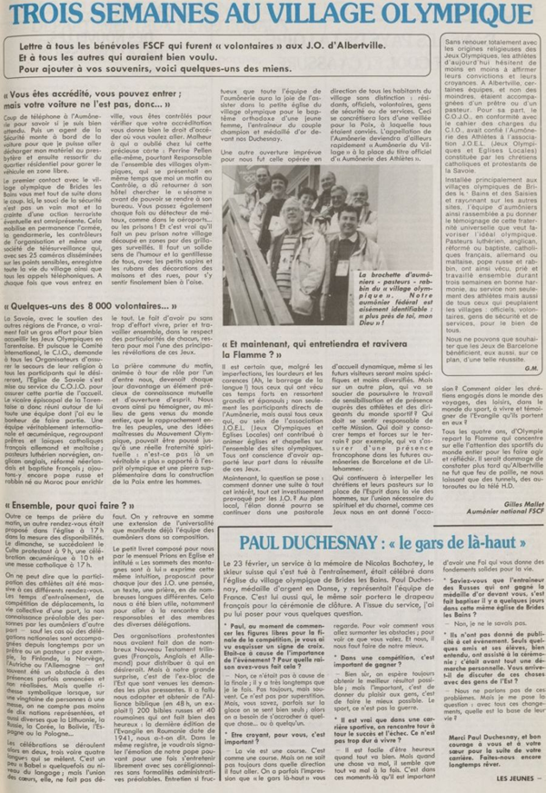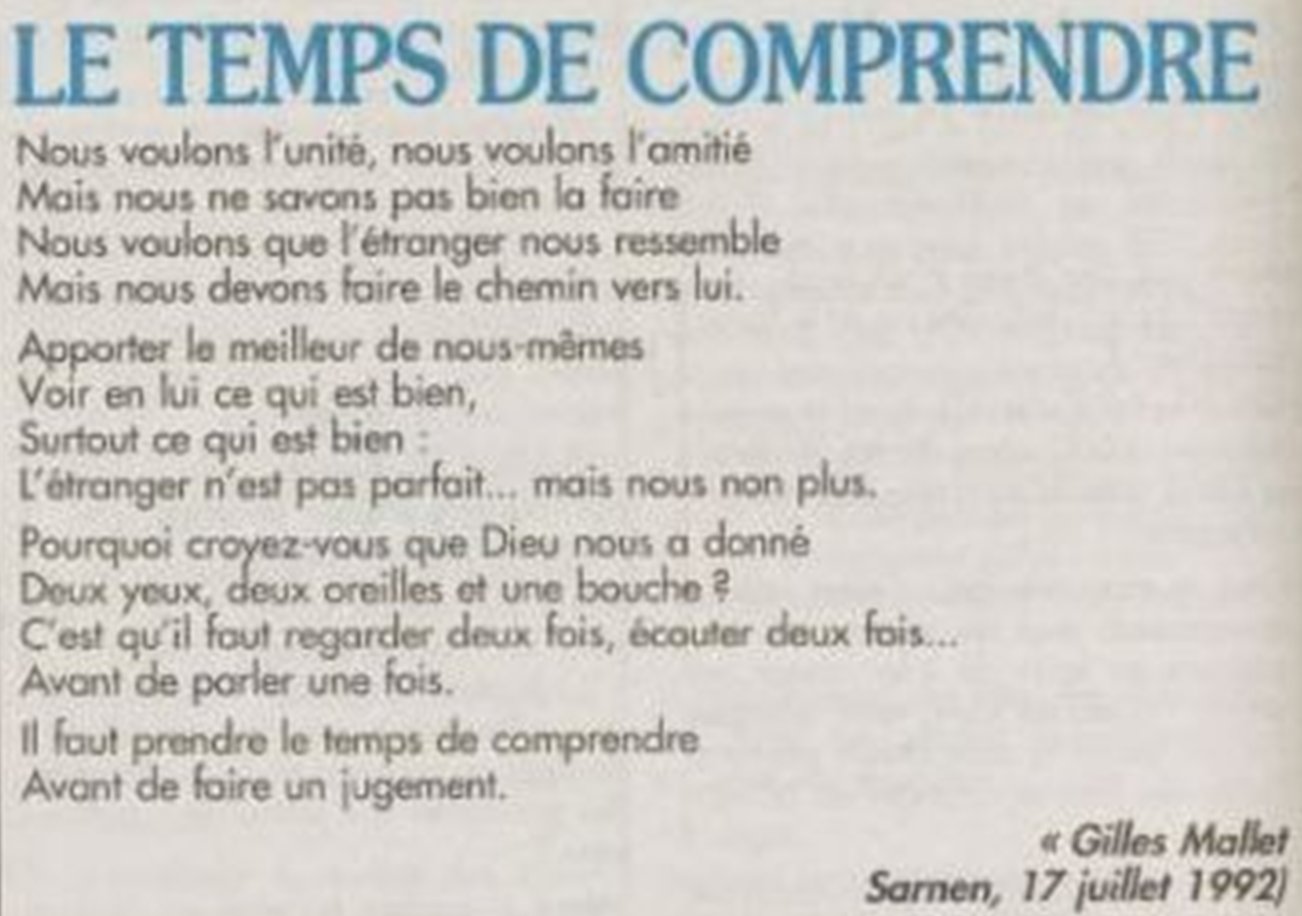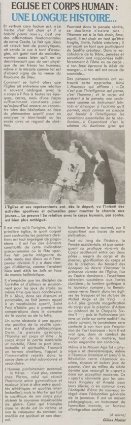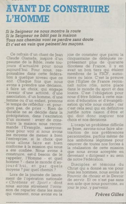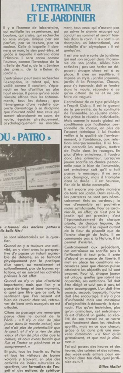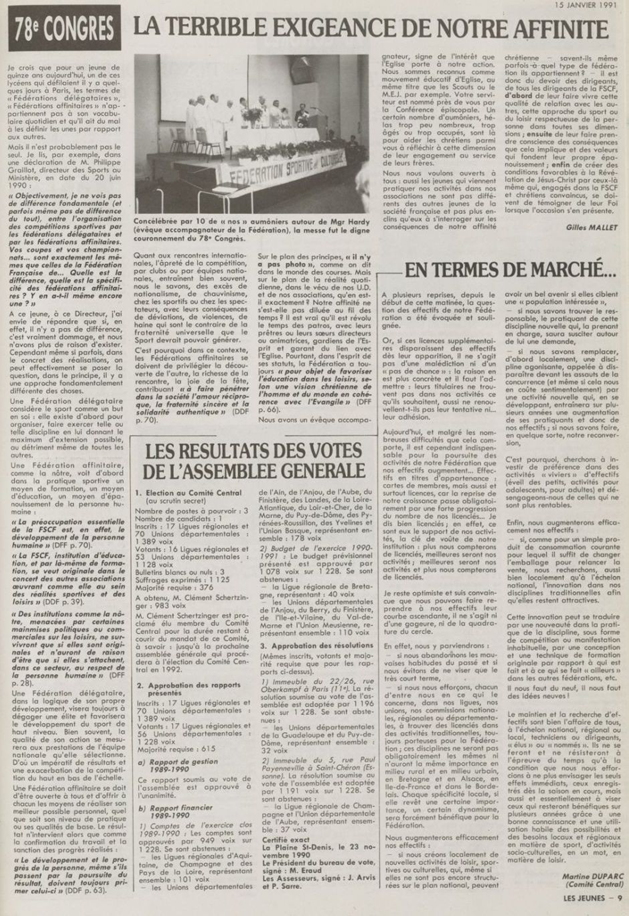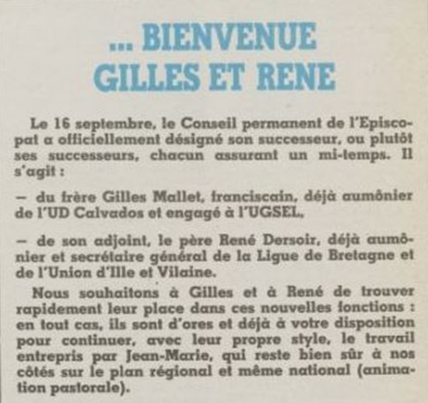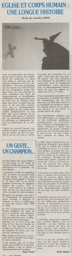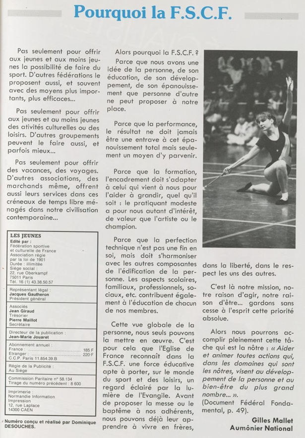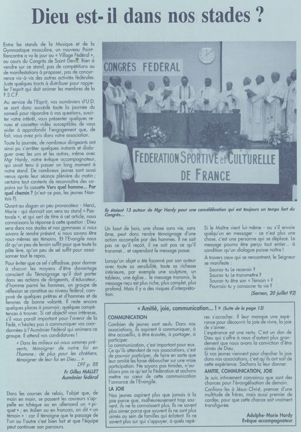 1993. Décédé en novembre 2014. BiographieGilles Mallet, né le 06 novembre 1938 à Rennes, fait ses études secondaires au Lycée Saint-Martin de Rennes dirigée par les pères Eudistes de 1949 à 1956. Il entre alors au noviciat des Franciscains à Quimper et passe une licence en théologie à l'Université catholique de Lille. Après 26 mois de service militaire dans l'Aéronavale, dont la moitié au Maroc, il est ordonné prêtre le 11 février 1965 au couvent de Rennes. Missionnaire de la mer et bénévole sportifIl est alors envoyé à Dieppe au service de la Mission de la mer où il reste 13 ans comme marin-pêcheur et/ou magasinier à la coopérative maritime. Puis nommé à Caen pour accompagner la formation des novices franciscains, il se propose comme simple bénévole pour encadrer le tennis de table à l'Avant-Garde Caennaise. C'est ainsi qu'il fait connaissance avec la Fédération sportive et culturelle de France (FSCF) et l'Union générale sportive de l'enseignement libre (UGSEL) dont il encadre des stages sportifs l'été. Il est alors sollicité pour faire partie de la commission pastorale nationale de cette dernière. La Fédération sportive et culturelle de FranceIl en démissionne en 1988 pour assumer avec René Dersoir, déjà en place depuis un an, l'aumônerie de la FSCF. En effet de 1988 à 1992 deux aumôniers se partagent le territoire fédéral. René Dersoir, ancien basketteur de l’Avenir de Rennes est responsable de l'Ouest, du Sud-ouest, du Centre, de la Polynésie et de la Guadeloupe alors que Gilles Mallet a en charge le Nord, l'Est, le Sud et la Fédération internationale catholique d'éducation physique et sportive (FICEP). Le début de son mandat est marqué par les festivités du 90e anniversaire de la FSCF initiées avant son arrivée. Une messe solennelle à la cathédrale Notre-Dame de Paris accompagnée par les meilleurs chanteurs et musiciens de la FSCF lance les opérations à l'occasion du congrès fédéral le 27 novembre 1987. Le 24 Juillet 1988, il est à Compostelle aux côtés du président Maurice Davesne, opération mûrie depuis cinq ans par la FSCF. pour y accueillir les 99 pèlerins fédéraux La période suivante est plus troublée. Après une année de fêtes, le congrès fédéral 1988 est marqué par une crise de succession qui amène le vice-président Max Eraud à se charger de la présidence provisoire dans un contexte très tendu. En 1990, celui-ci laisse place à Jacques Gautheron qui ne revient que pour deux années de mandat également. En 4 ans, Gilles Mallet cotoie donc 3 présidents successifs : Maurice Davesne, le général Max Eraud, Jacques Gautheron et assiste à l'avènement de Clément Schertzinger. Il occupe également le poste d'aumônier de la FICEP pendant trois ans mais reconnaît que sa méconnaissance de l'allemand a considérablement limité la portée de cette fonction. Responsabilités actuellesÀ la suite de cette mission nationale, il est envoyé pour 9 ans à Rouen comme asssistant spirituel des fraternités laïques franciscaines de Seine-Maritime. Puis il occupe ces mêmes fonctions au diocèse de Quimper jusqu'en 2012. sources : FSCF, WikipédiaAccueil du nouvel aumônier national dans Les Jeunes en 1987 Mot dans la revue Les Jeunes 1988 : Pourquoi la FSCF Mot dans la revue Les Jeunes 1988 : Avant de construire l'homme Mot dans la revue Les Jeunes 1990 : Les associations FSCF de l'an 2000 : ghettos, viviers ou sans saveur Mot dans la revue Les Jeunes 1991 : Pourquoi la FSCF Mot dans la revue Les Jeunes 1991 : La terrible exigeance de notre affinité Mot dans la revue Les Jeunes 1991 : Evolution et révolution du bénévolat Mot dans la revue Les Jeunes 1991 : Eglise et corps humain, une longue histoire Mot dans la revue Les Jeunes 1991 : Bénévole par obligation Mot dans la revue Les Jeunes 1991 : Eglise et corps humain, une longue histoire ( suite ) Mot dans la revue Les Jeunes 1991 : Consommateurs ou producteurs Mot dans la revue Les Jeunes 1992 : Trois semaines au village olympique Mot dans la revue Les Jeunes 1992 : L'entraineur et le jardinier Mot dans la revue Les Jeunes 1992 : Pour ne pas oublier qui nous sommes Mot dans la revue Les Jeunes 1993 : Le temps de comprendre Mot dans la revue Les Jeunes 1993 : Dieu est-il dans nos stades Mot dans la revue Les Jeunes 1993 : Préserver qui, préserver quoi Mot dans la revue Les Jeunes 1993 : FSCF : Faire du Sport Comme des Frères Adieu à l'ancien aumônier national dans Les Jeunes en 2015 article dans le numéro spécial sur le sport de Fêtes et saisons en 1991 : L'Eglise face au sport |