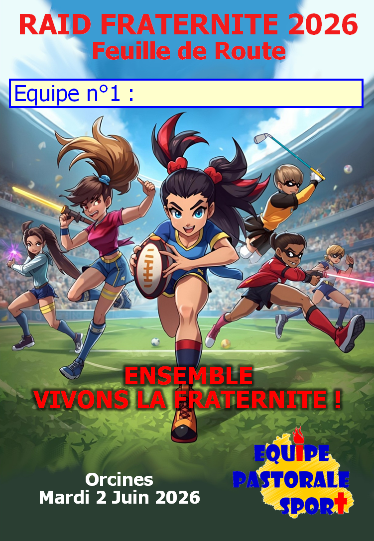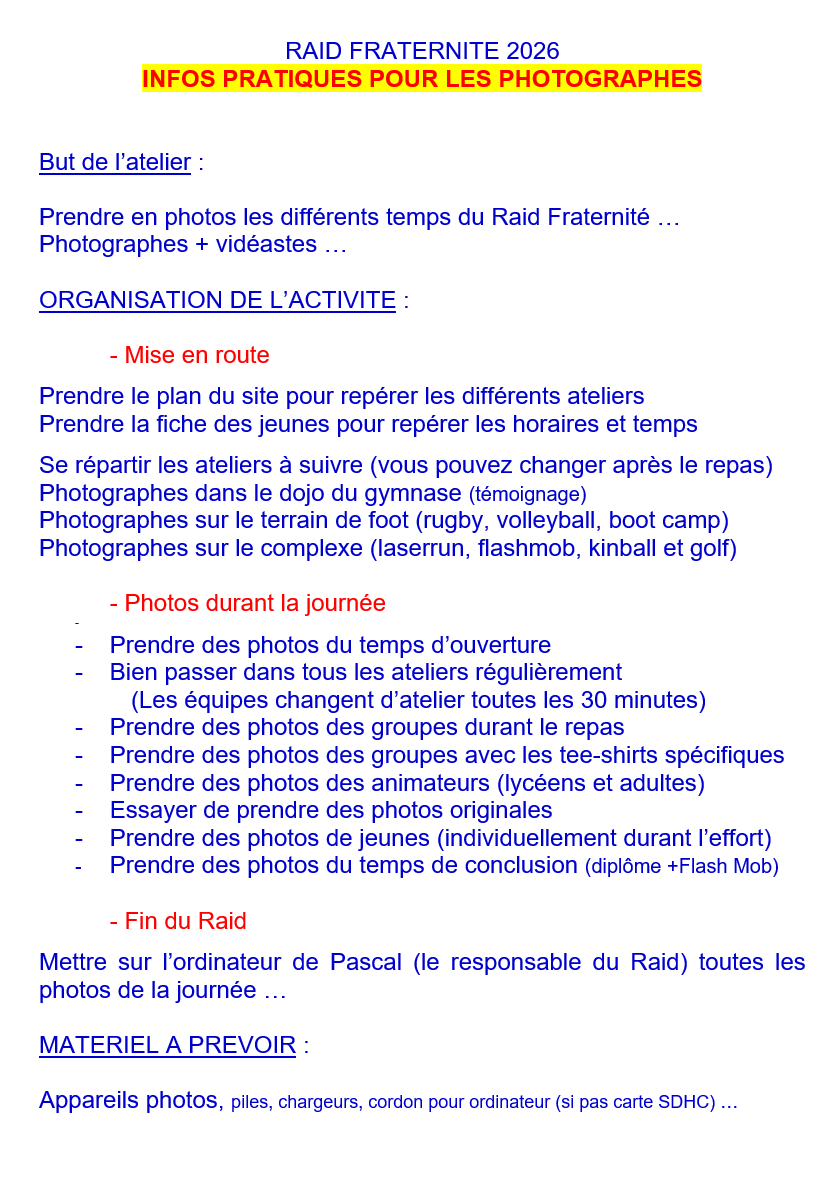 ANCIENS RAID FRATERNITE - 1° Raid Fraternité 2009 - 2° Raid Fraternité 2010 - 3° Raid Fraternité 2011 - 4° Raid Fraternité 2012 - 5° Raid Fraternité 2013 - 6° Raid Fraternité 2014 - 7° Raid Fraternité 2015 - 8° Raid Fraternité 2016 - 9° Raid Fraternité 2017 - 10° Raid Fraternité 2018 - 11° Raid Fraternité 2019 - 12° Raid Fraternité 2022 - 13° Raid Fraternité 2023 - 14° Raid Fraternité 2024 - 15° Raid Fraternité 2025 DOCUMENTS DE TRAVAIL - Vidéo du Flash Mob DOSSIER DE PRESSE - flyer de présentation - Powerpoint de présentation - Couverture - Communiqué de presse - Présentation de l'EPS - Affiche du RAID - Projet du Raid Fraternité - Programme de la journée du 2 Juin PHOTOS DU RAID DOCUMENTS DIVERS - Temps d'ouverture du Raid - Plan des ateliers - Feuille de route : recto - verso - Fiche photographes - Charte du Raid Fraternité - Atelier 1 : Bootcamp : Fiche Animateur - Atelier 2 : Volletball assis : Fiche Animateur - Atelier 3 : Golf : Fiche Animateur - Atelier 4 : Kin Ball : Fiche Animateur - Bénédicité du Raid Fraternité - Atelier 5 : Laser Run : Fiche Animateur - Atelier 6 : Touch Rugby : Fiche Animateur - Atelier 7 : Témoignage : Fiche Animateur - Atelier 8 : Flashmob : Fiche Animateur - Flash Mob final : vidéo - Temps de conclusion du Raid - Autocollant du Raid - Diplôme des équipes - Document : droit à l'image |