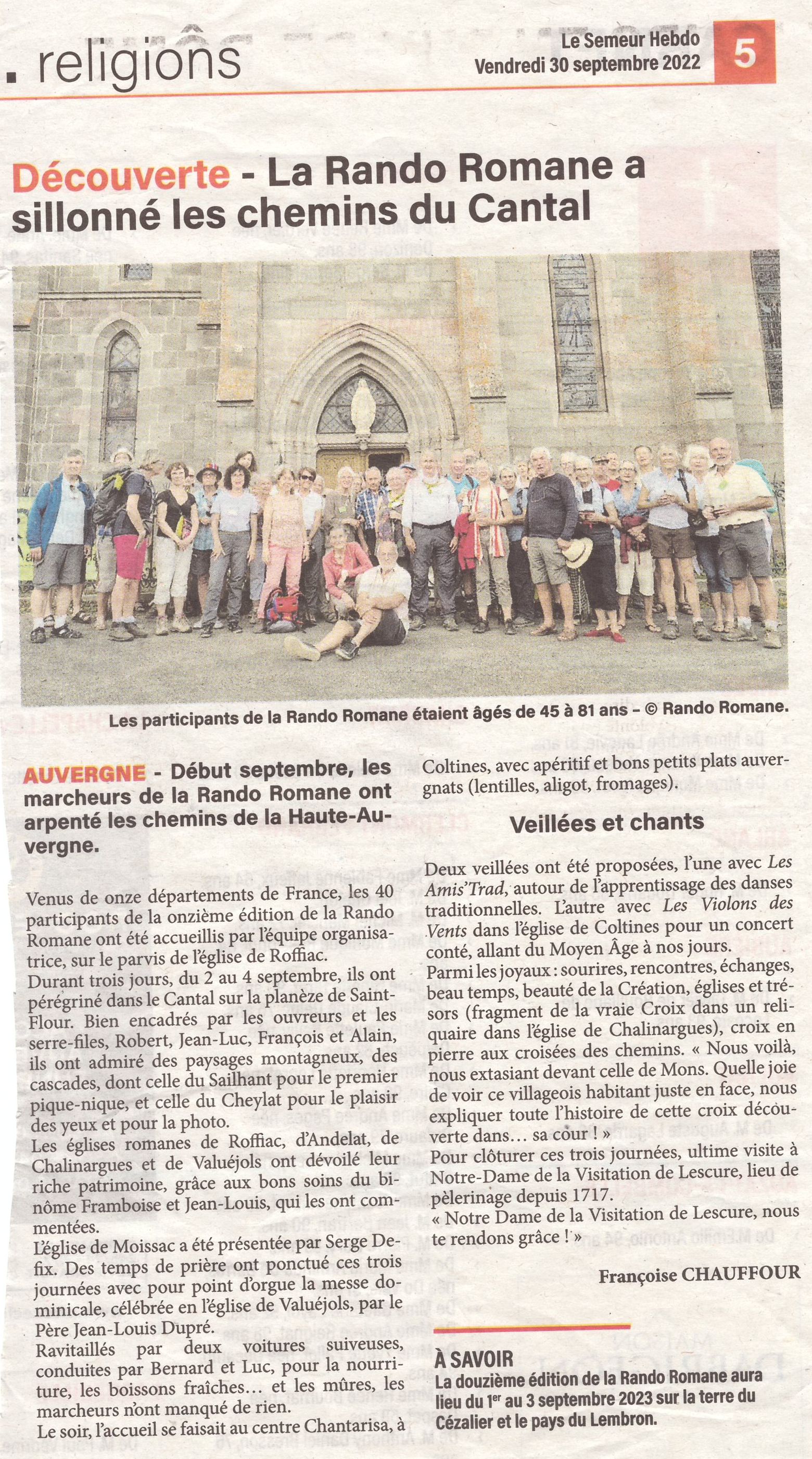 Pèlerine, sandales et besace ont été remplacées par une cape imperméable, des chaussures confortables et un sac à dos fonctionnel ... Mais les nouveaux pèlerins suivent fidèlement les ancêtres qui ont tracé la route. Au XIIe siècle, les échanges étaient déjà nombreux : pèlerins, marchands, croisés rapportèrent de leurs voyages des idées de décors et de techniques que les artistes locaux accommodèrent ensuite à leur propre besoin. Ces influences byzantines, mozarabes se retrouvent sur chacune des églises romanes d‛Auvergne où s‛entremêlent les formes et les couleurs qui se jouent de l‛arkose et de la pierre volcanique. L‛Auvergne recèle quelque 240 églises romanes chargées d‛Histoire et de beauté. Qui sommes-nous ? Une équipe de 9 organisateurs qui nous retrouvons régulièrement pour offrir un programme renouvelé chaque année. Comment est née la Rando Romane ? Suite à l’expérience du Tro-Breiz en Bretagne, l’idée est venue de proposer quelque chose en Auvergne reprenant le même esprit, mais seulement sur 3 jours et avec 40 participants, nous ne sommes donc pas plus de 50 personnes en tout. Que proposons-nous ? Chaque année, un territoire à découvrir en Auvergne. La Rando Romane ? C’est 3 jours de randonnée à vivre avec un esprit à la fois sportif, culturel, spirituel, convivial et festif. La Rando Romane propose à des personnes venues d’horizons différents, d’âges variés et de conditions physiques inégales, de se rassembler, de cheminer et de franchir le seuil d’églises.Rencontres, échanges, émerveillement devant la beauté de la nature, devant le riche patrimoine laissé par nos ancêtres nous transmettant ainsi leur Foi. LES EDITIONS Rando Romane 2026 / 4-6 Septembre / Affiche / ... Rando Romane 2025 / 5-7 Septembre / Affiche / Compte-rendu / diaporama Rando Romane 2024 / 6-8 Septembre / Affiche / Compte-rendu / article / reportage Rando Romane 2023 / 1°-3 Septembre / Affiche / diaporama / Compte-rendu / article / Article / Article Rando Romane 2022 / 2-4 Septembre / Affiche / Compte-rendu / article / Article / Article / Diaporama Rando Romane 2021 / 27-29 Août / Affiche / Article / Article / article / Diaporama Rando Romane 2020 / 21-23 Août / Affiche / Article / Article / article / Photo / Diaporama Rando Romane 2019 / 23-25 Août / Affiche / Article / Article / Article / diaporama / article Rando Romane 2018 / 31 Août - 2 Septembre / Affiche / Article / Article / diaporama / Compte-rendu Rando Romane 2017 / 25-27 Août / Affiche / Article / Diaporama / Photo / Compte-rendu / article Rando Romane 2016 / 26-28 Août / Affiche / Article / Article / diaporama / Compte-rendu Rando Romane 2015 / 21-23 Août / Affiche / Article / Article / Diaporama Rando Romane 2014 / 22-24 Août / Affiche / Article / Diaporama Rando Romane 2013 / 23-25 Août / Affiche / Compte-rendu / photo / article / article / article / Diaporama Rando Romane 2012 / 24-26 Août / Affiche / annonce / diaporama / article / article contact : randoromane63@laposte.net / 06 80 52 05 01 ou 06 24 01 28 25 |