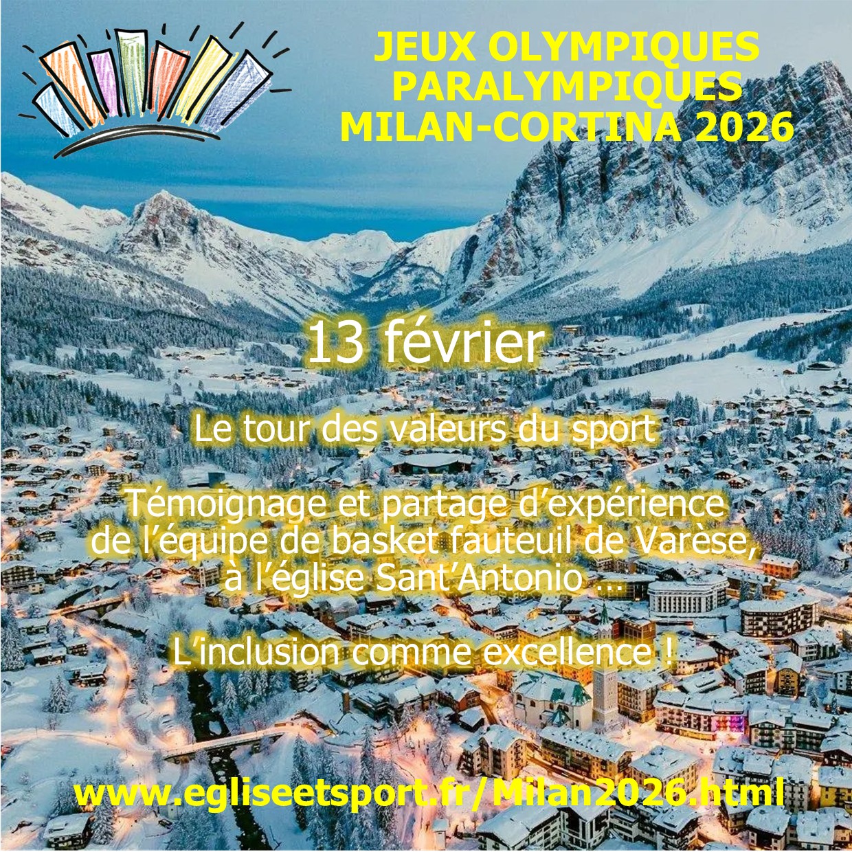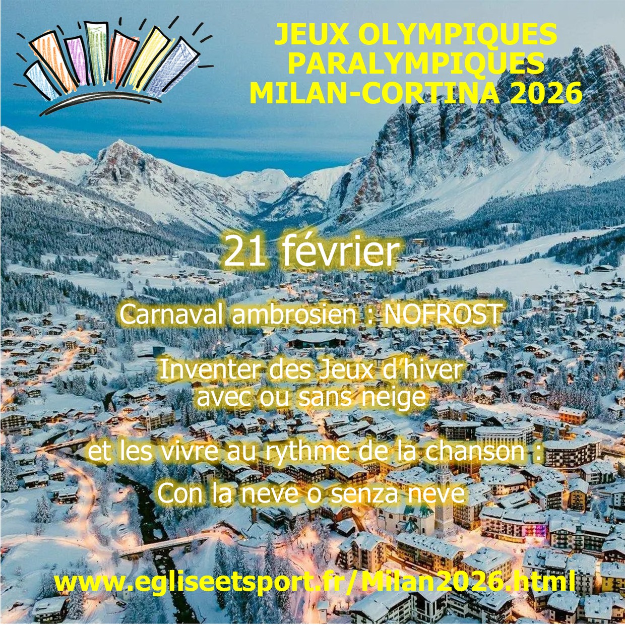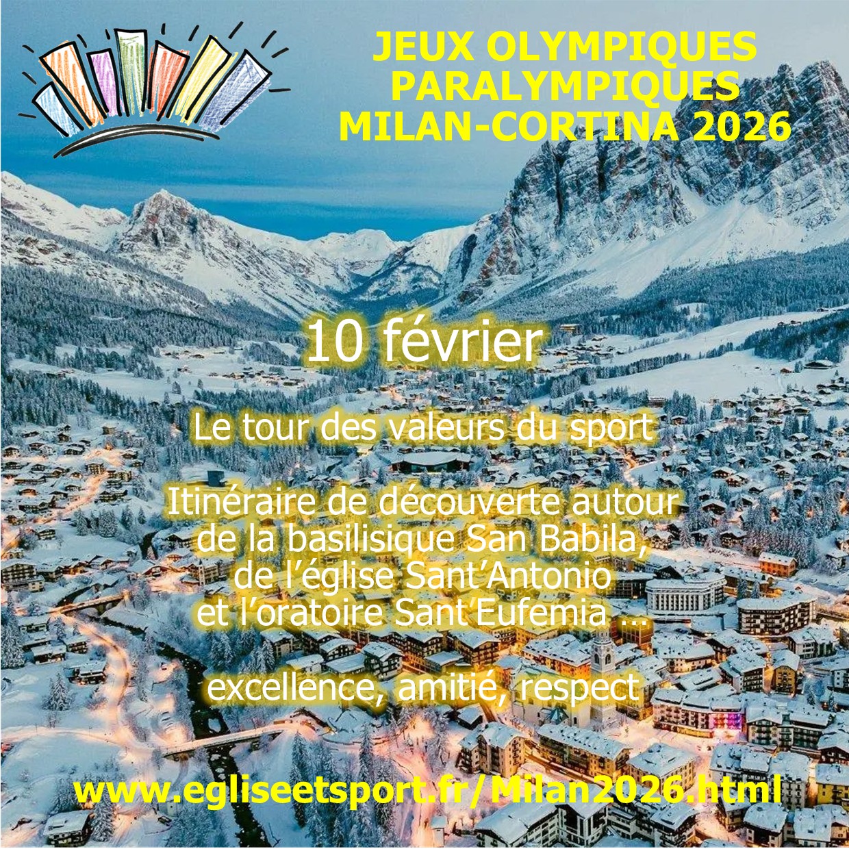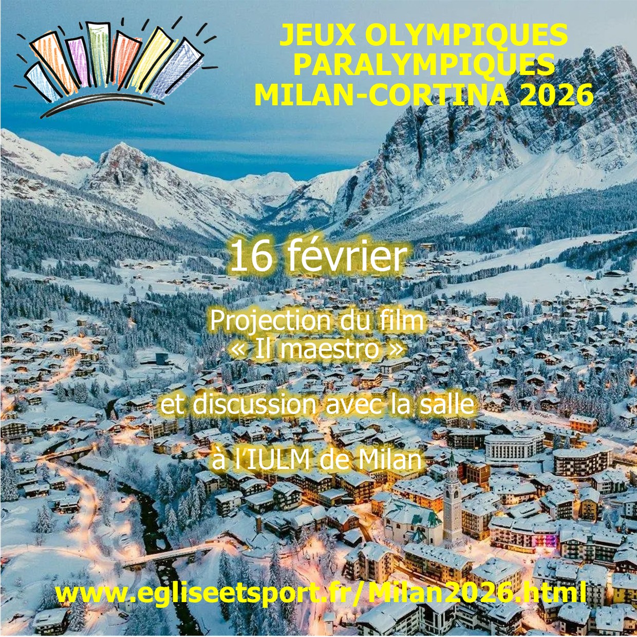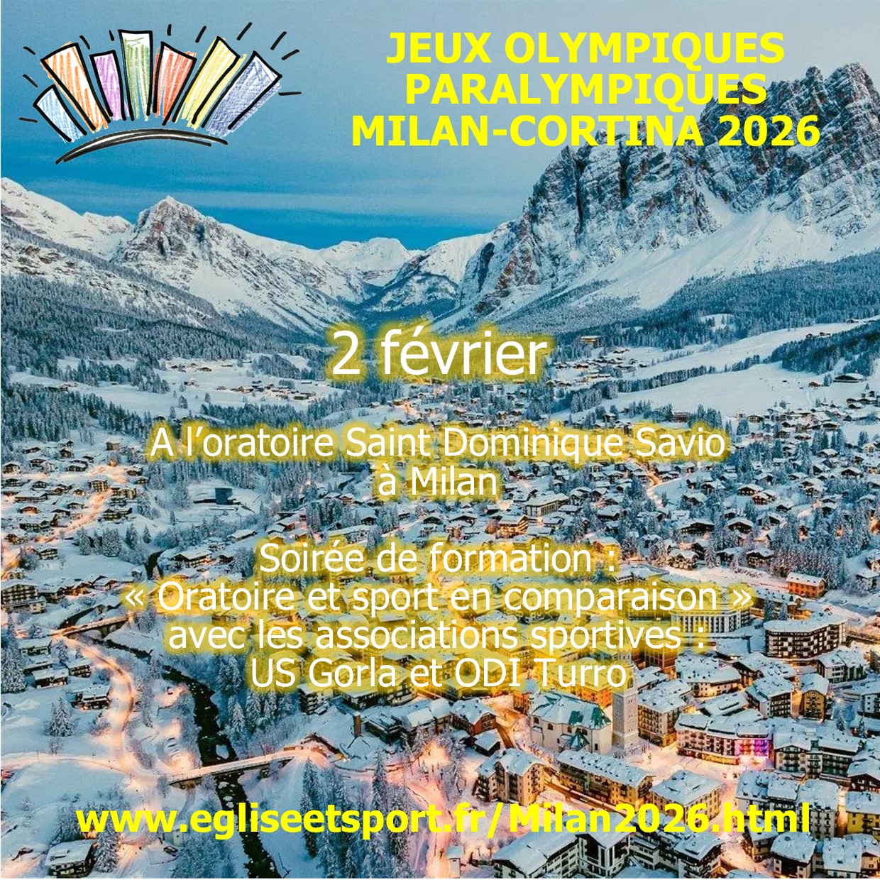 Allumage de la "Torche" olympique lors de la rencontre de l'archevêque avec le monde du sport : 17 octobre 2022 Tournée de la Torche Orasport on fire tour dans les doyennés du diocèse Projet : Ne limitez pas le talent ! Projet : Sur le terrain ! Projet : Oratoire et sport, éduquer ensemble c'est possible ! Discours de Mgr Mario Delpini, archevêque de Milan au siège du Comité Olympique Italien : 23 novembre 2023 Le sport, un bien commun, un bien personnel Rencontre diocésaine du monde du sport : 16 octobre 2023 Rencontre diocésaine du monde du sport : 14 octobre 2024 Rencontre diocésaine du monde du sport : 24 octobre 2025 Conseil pastoral diocésain : sport, vie chrétienne et mission de l'Eglise : 22-23 novembre 2025 : programme / compte-rendu Basilique San Babila : église olympique et paralympique : article de L'Osservatore Romano messes à la Basilique en différentes langues : 8 et 15 Février et 8 Mars Conférence de presse de présentation du programme "For each other" du diocèse de Milan le 23 janvier 2026 : annonce / compte-rendu / site : www.chiesadimilano.it/foreachother/ message du Cardinal Tolentino, préfet du Dicastère pour la culture et l'éducation discours de Mgr Mario Delpini : Vidéo en italien Semaine de l'éducation : oratoire et sport : 21-31 janvier 2026 : Présentation / réflexion guide : Educatori in campo / 5 passi per la verifica del servizio educativo : couverture / Présentation Salon de la formation : 24 janvier 2026 à Ceveso : Présentation Rencontre "Le sport qui éduque" 26 Janvier 2026 : affiche Fête de Saint Don Bosco, patron des sportifs : 31 Janvier 2026 Assemblée des oratoires : 14 février 2026 : Fiche de comparaison en italien Message de Mgr Mario Delpini : Vidéo en italien / compte-rendu de l'assemblée Dimanche diocésain "For Each Other" dans les paroisses : 15 Février 2026 : Présentation Document : "sport, vie chrétienne et mission" : document en italien Prière des sportifs pour les Jeux Olympiques et Paralympiques de Milan-Cortina 2026 ( original en italien ) Messe de l'accueil de la croix des sportifs : 29 janvier 2026 : Basilique San Babila à Milan : compte-rendu interview du président d'Athletica Vaticana par la Stampa homélie de Mgr Delpini en anglais Proposition "Tour des valeurs du sport" dans le centre de Milan durant les Jeux : Présentation 9-13 Février / 16-20 Février / 9-13 Mars 2026 Jeux d'argent et adolescents : soirées pour apprends à jouer à "Breaking the rules" : Présentation 9 Février 2026 : pour les éducateurs / 16 Février 2026 : pour les adolescents Témoignage de Giordano Bortolani, joueur de basket-ball, et les valeurs du jeu d'équipe : 9 février 2026 Témoignage d'Astro roller skating : le sport comme outil de croissance et de socialisation : 10 février 2026 Témoignage de l'équipe de basket fauteuil de Varèse : l'inclusion comme excellence : 11 février 2026 Témoignage d'Ettore Messina, entraîneur de basket : la culture du talent : 12 février 2026 Témoignage de l'entraineur de l'équipe de basket de Sanga Milano : le chemin vers l'excellence : 13 février 2026 Témoignage de Powervolley de Milan : excellence sportive et sociale Exposition : Un sport de valeur : église Sant'Antonio : 9 Février 2026 : inauguration Proposition : Bénévoles pour les Jeux Prière et spectacle intereligieux : Dans la trêve olympique : 12 Février 2026 : Affiche / Présentation / Compte-rendu Rencontre interreligieuse : Le sens du sport : 17 Février 2026 Projection du film "Il Maestro" et discussion : 16 Février 2026 Carnaval ambrosien : NOFROST – Le grand jeu que nous attendions d'Ampezzo : 21 Février 2026 : Présentation / affiche chanson : Con la neve o senza neve / Paroles / paroles en italien Pièce de Théâtre : Citius, Altius, Fortius : 24 Février 2026 : Affiche / Présentation / Teaser Sport et handicap : Présentation Concert inclusif : Comme le levain dans la pate : 18 Février et 11 Mars 2026 : Présentation match de football inclusif avec le Centre Sportif Universitaire : 10 Mars 2026 marche inclusive : Tous ou personne : 14 Mars 2026 Rencontre témoignage sur le sport dans les pays pauvres : Le revers le la médaille : 19 Février 2026 : Présentation Jeux de l'espoir à la prison de Bollate : 28 Février 2026 : Présentation / Article / Logo Parcours : Les chemins de la beauté : 7-22 Février / 7-15 Mars 2026 : Présentation 5 webinaires : D'Olympie à Milan-Cortina : 21 Janvier / 28 Janvier / 4 Février / 11 Février / 18 Février / brochure en italien Semaine de l'éducation : oratoire et sport : 21-31 janvier 2026 : Présentation / réflexion guide : Educatori in campo / 5 passi per la verifica del servizio educativo : couverture / Présentation Salon de la formation : 24 janvier 2026 à Ceveso : Présentation Rencontre "Le sport qui éduque" 26 Janvier 2026 : affiche Fête de Saint Don Bosco, patron des sportifs : 31 Janvier 2026 Assemblée des oratoires : 14 février 2026 : Fiche de comparaison en italien "Histoires de sport" avec Athletica Vaticana sur Radio Vatican : 5 Février 2026 : slide / video en italien Interview de Mgr Delpini par la Gazzetta dello sport : 5 Février 2026 Article d'Il Segno le 22 janvier 2026 : La flamme qui unit les générations ! Interview d'un membre de l'action catholique créateur de l'hymne olympique ! Diocèse de Belluno-Feltre : www.chiesabellunofeltre.it (Cortina D'Ampezzo) messe pour les sportifs présidée par l'évêque : 27 Janvier 2026 Réflexion de Mgr Renato Marangoni : Vers les Jeux, notre Eglise, un chantier de paix : 25 Janvier 2026 Archidiocèse de Trente : www.diocesitn.it/ (Tesero et Predazzo) Prière oecuménique pour célébrer l'unité entre les peuples : 19 Février 2026 à Tesero : Présentation / Affiche / Vidéo / Compte-Rendu Diocèse de Come : www.diocesidicomo.it/ (Bormio et Livigno) Messe pour les Jeux Olympiques : 30 janvier 2026 à Bormio : Homélie du Cardinal Cantoni Diocèse de Bolzano-Bressanone : www.bz-b