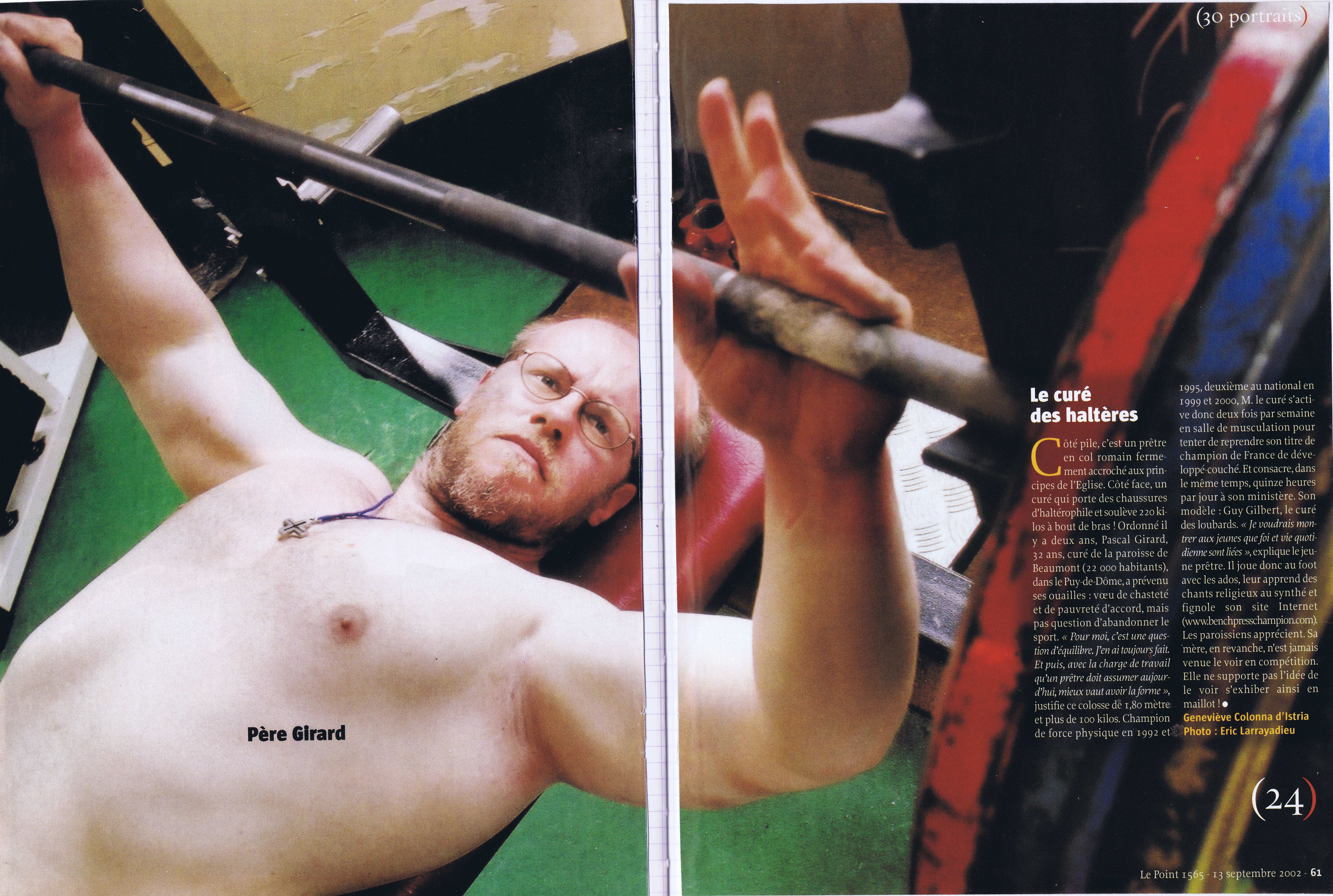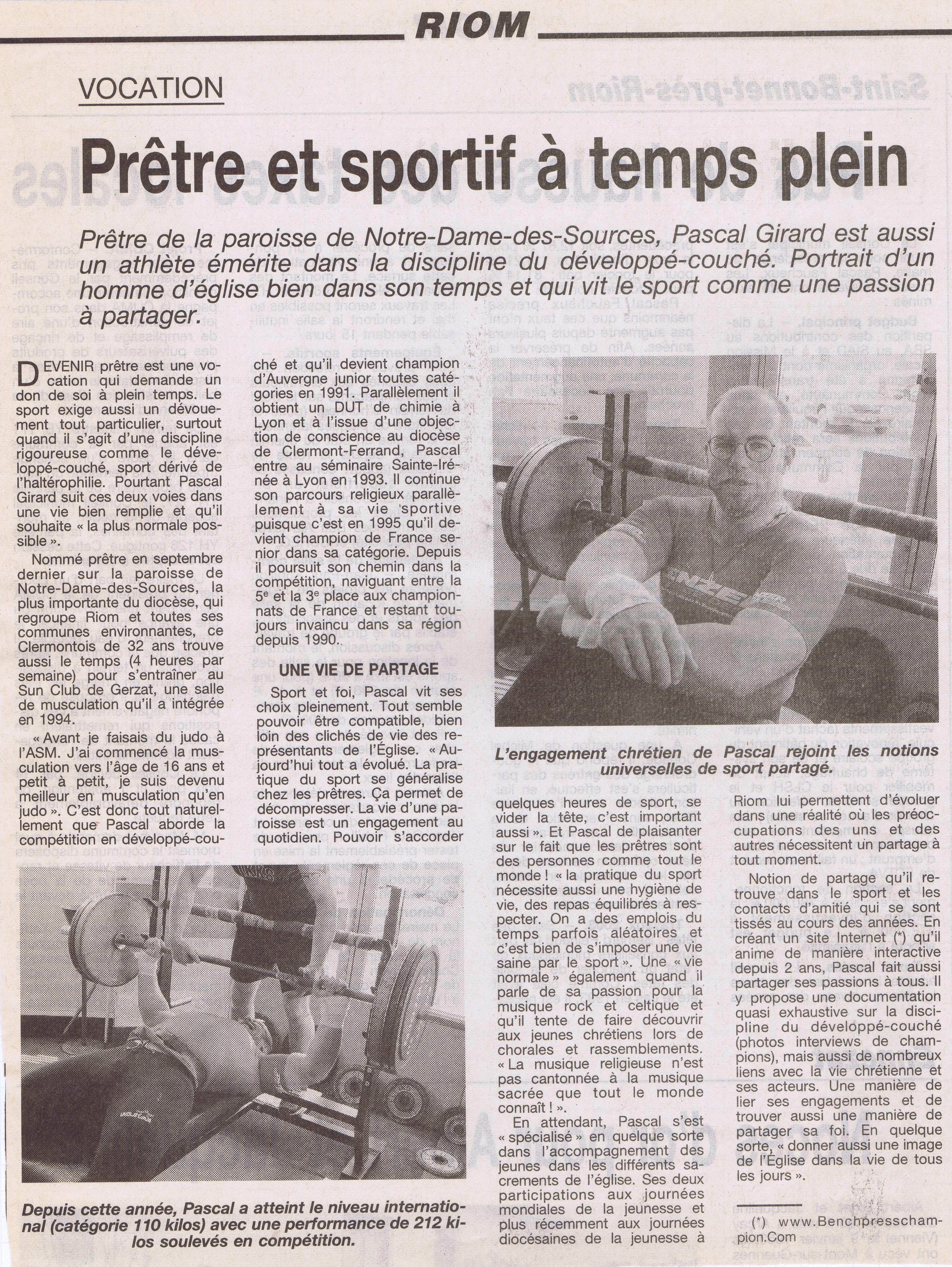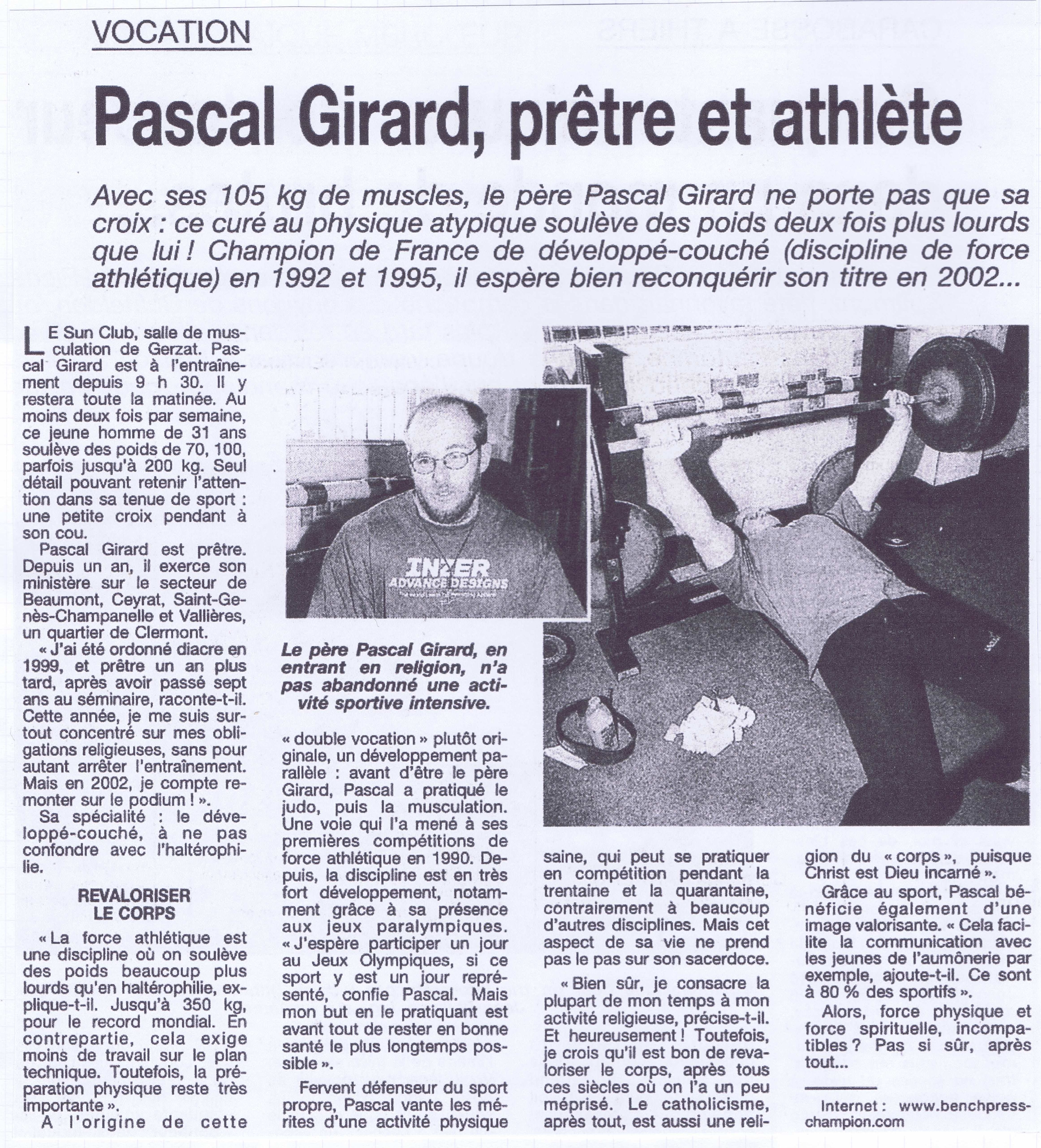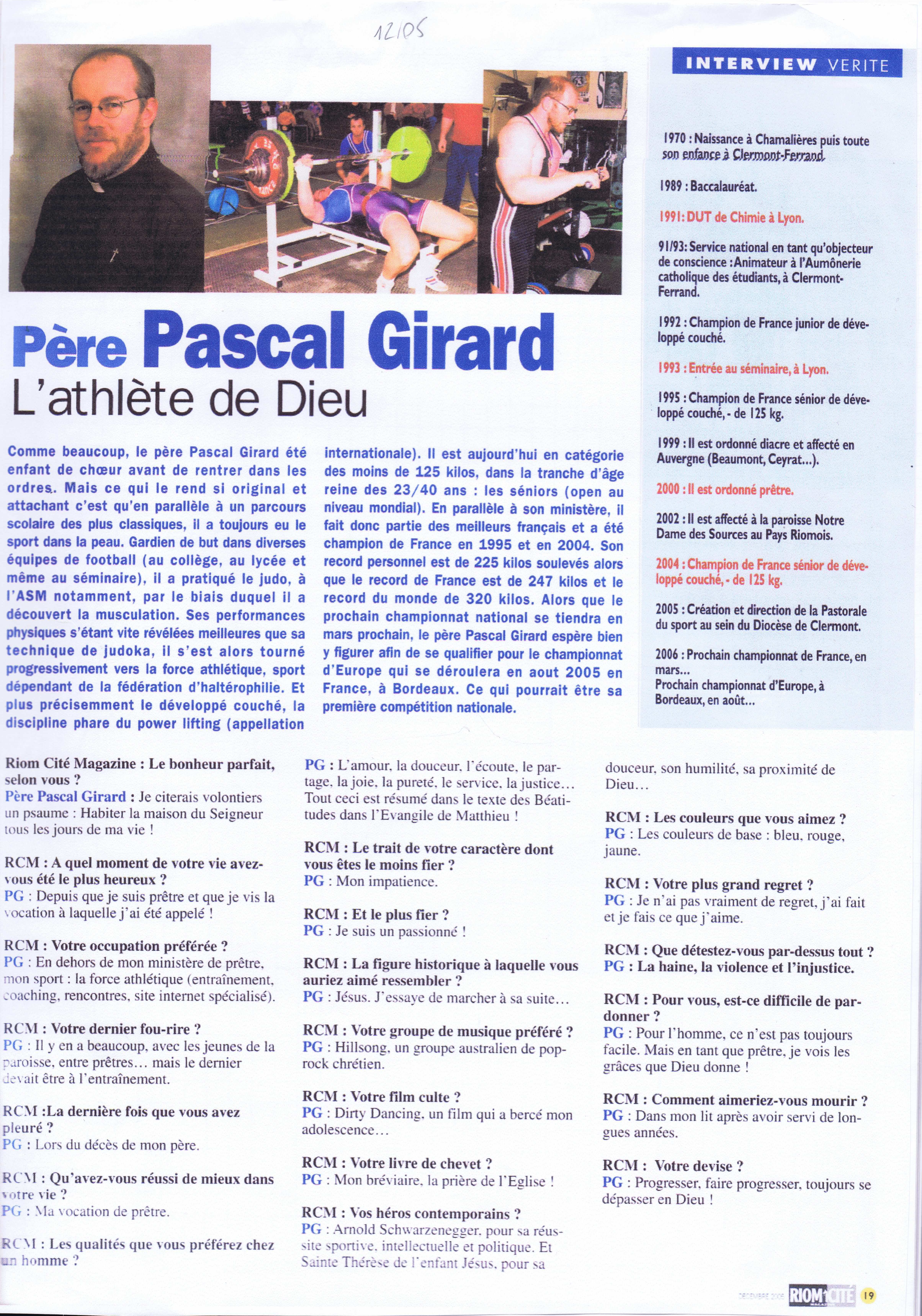 Une exposition des grands sportifs et évènements de Riom : 27 Juin 2024 RIOM, TERRE DE JEUX ! : article - vidéo Une exposition avec les portraits dans la ville de champions riomois dont le père Pascal Girard ... Nouvel article sur un site internet ... CLERMONT-FERRAND : LA FORCE ET L'ESPRIT DES JEUX Site internet de la conférence des évêques de France du 15 Février 2024 ! Article de Florence de Maistre dans le cadres des Jeux de Paris 2024 ... Nouvel article sur un site internet ... DES CHANSONS POUR TRANSFORMER L'ESSAI Sur le site d'au cabaret du bon Dieu du 12 Février 2024 ! Réponse du père Pascal Girard au questionnaire de Robert Migliorini ... Membre de l'équipe de rédaction d'un livre ... EGLISE ET SPORT Numéro de la revue "Documents Episcopat" ... Mai 2022 ! Equipe de rédaction : Alain Paillard, Gilles Lecocq, père Pascal Girard et Pascal Balmand ... Couverture et article dans l'hebdomadaire du Semeur Hebdo : ... PASCAL GIRARD : PRETRE ET SPORTIF Journal : LE SEMEUR HEBDO, Rubrique : l'invité ... 13 Mai 2016 ! Mohammed Afiri, journaliste du Semeur m'interviewe sur mon parcours ... Reportage photos sur les prêtres et le sport : ... PRETRES ET SPORTIFS Site internet : dominiquedelpoux.fr/pretres-sportifs ... Juin 2014 ! Le photographe Dominique Delpoux me recontre pour faire un portrait photos du sportif et du prêtre ... Nouvel article d'un hebdomadaire chrétien : ... LE SPORT, TERRAIN D'EVANGELISATION POUR L'EGLISE Journal : LA CROIX : rubrique : religion ... 2 Mai 2013 ! Page de présentation et d'interview de Bruno Bouvet sur le congrès national de la Pastorale du sport ... Couverture et article dans l'hebdomadaire du Semeur Hebdo : ... PASCAL GIRARD, L'ATHLETE DE DIEU Journal : LE SEMEUR HEBDO, rubrique : L'invité de la rédaction ... 27 Février 2009 ! Jean-Baptiste Botella, journaliste du Semeur m'interviewe sur le sport et la foi ... Nouveaux articles de La Montagne, Pascal Girard et la Force Athlétique : ... LA FOI ET LA FORCE Journal : LA MONTAGNE, rubrique : Sport ... 30 Novembre 2008 ! Un journaliste et son photographe viennent faire découvrir notre discipline au Sun Club ... AIDE LA PUISSANCE A MONTER EN TOI Journal : LA MONTAGNE, rubrique : Alternative Sport ... 10 Décembre 2008 ! Article rédigé pour la revue Prêtres Diocésains PASTORALE DU SPORT : TERRAIN D'EVANGELISATION Revue : Prêtres Diocésains ... rubrique : Ministère et vie des prêtres : Novembre 2008 ! Article de réflexion que le père Pascal Girard a écrit pour parler d'Evangélisation par le sport ... Deuxième article d'un hebdomadaire chrétien ... NOURRIR SON AME SANS NEGLIGER SON CORPS Journal : LA CROIX, rubrique : Portrait ... 3 Septembre 2007 ! Article de Géraldine Houot sur le prêtre responsable de la pastorale du sport ... Grand reportage dans un mensuel sportif : ... MON CURE CHEZ LES CULTURISTES ! Journal : Sports Auvergne n°8 ... Mars-Avril 2007 ! Reportage de la revue Sports Auvergne : photos de Ludovic Combe, article de Frédéric Vernou ... Un article dans un journal de l'est ... PASCAL GIRARD, LA FOI DANS LA FORCE ATHLETIQUE ! Journal : Le républicain lorrain ... 5 Mai 2006 ! A l'occasion des championnats d'Europe GPC à Saint Avold où je suis venu prendre des photos ... Une interview du journaliste Bernard Mathis sur un curé insolite ! Premier article dans un quotidien sportif : ... RIOM, AU FIL DES TEMPS : PERE PASCAL GIRARD ! Journal : L'Equipe Magazine, rubrique : une ville, un champion ... 22 Avril 2006 ! Le rédacteur en chef de l'équipe magazine contacte le père Pascal Girard pour rédiger un article ... Un article de fin d'année : ... PERE PASCAL GIRARD : L'ATHLETE DE DIEU ... ! Journal : Riom Cité Magazine ... Décembre 2005 ! Le journal de Riom et des environs distribué dans toutes les boites gratuitement me contacte ... Une interview vérité avec le questionnaire de Proust ! Première Interview pour un site internet : ... (BIBLE)²+(BICEPS)²+MP3 = PPG Site Internet : club.acsv.9online.fr ... 24 Novembre 2004 ! Par Bernard Vincent, webmaster du site internet de Force du club de Saint Vallier ... Premier article d'un hebdomadaire chrétien, rencontre avec Luc Adrian : ... PERE PASCAL GIRARD : SCHWARZY CLERGY Journal : FAMILLE CHRETIENNE, rubrique : Rendez-vous ... 17 Janvier 2004 ! Rencontre au mois d'Août pour parler sport et pastorale ... Nouvel article de La Montagne, le prêtre parle de son ministère : ... PRETRE ET SPORTIF A TEMPS PLEIN ! Journal : LA MONTAGNE, rubrique : Riom ... 29 Avril 2003 ! A quelques jours des championnats de France rencontre avec l'athlète ... Les articles de la rentrée : ... PERE GIRARD : LE CURE DES HALTERES ... ! Journal : LE POINT, numéro spécial 30 ans ... 13 Septembre 2002 ! A la suite de la campagne du conseil général, le portrait du père Girard a séduit ... il a été choisi pour être parmi 30 personnalités pour fêter les 30 ans ... Les articles de la rentrée : ... MON CURE CHEZ LES CULTURISTES ... ! Journal : INFO ... 20 Août 2002 ! Le journal du Puy de Dôme distribué dans toutes les boites gratuitement me contacte ... l'aspect prêtre et compétiteur intéresse toujours les journaux ! Une campagne d'année du Conseil Général : ... 40 PERSONNALITES QUI FONT PARLER DU PUY DE DOME ! Journal de voeux du Conseil Général ... Janvier 2002 ! 40 personnes du département souhaitent la bonne année aux habitants ... une campagne pour redonner une image dynamique du Puy-de-Dôme avec des passionnés ... Nouvel article de La Montagne, le séminariste est devenu prêtre : ... PASCAL GIRARD, PRETRE ET ATHLETE ! Journal : LA MONTAGNE, rubrique : actualité ... 21 Septembre 2001 ! un journaliste veut mettre en valeur le fait d'être prêtre et compétiteur ... Un article de journal pour annoncer mon ordination UN CHAMPION DE FORCE ORDONNE PRETRE Journal : LA MONTAGNE, rubrique : actualité ... 23 Juin 2000 ! un article qui présente Pascal Girard à la fois sportif et homme d'Eglise ... La premi