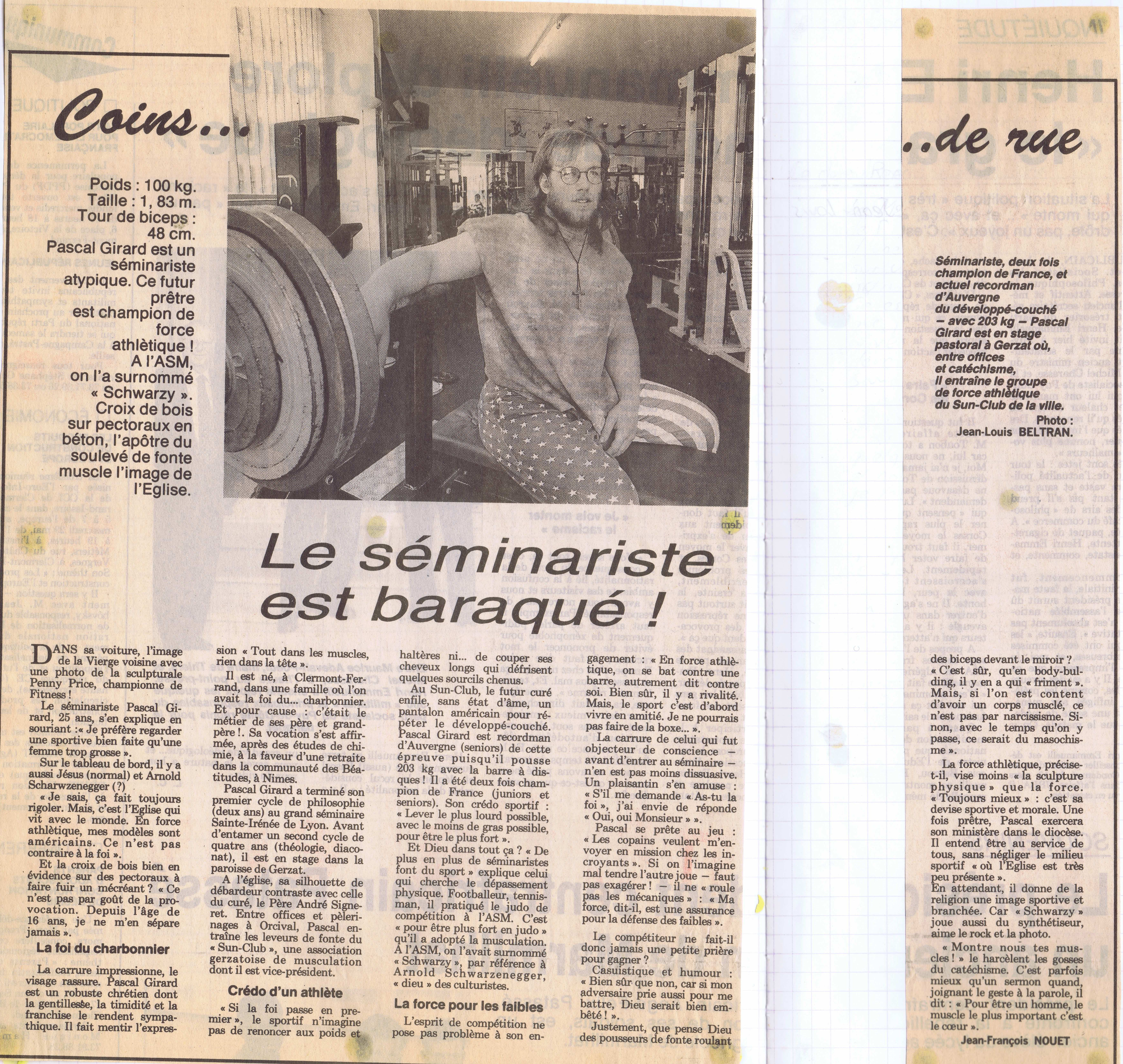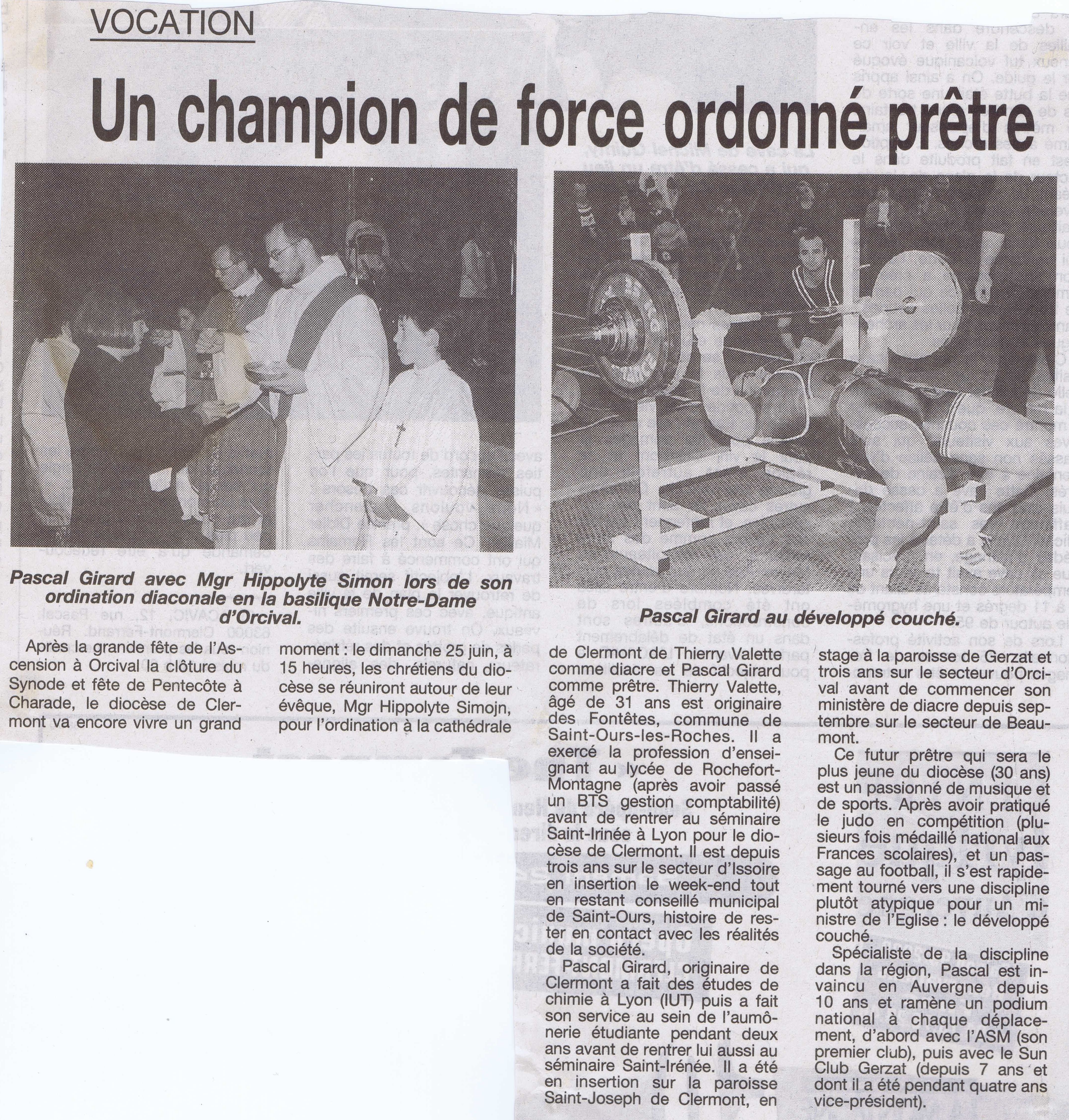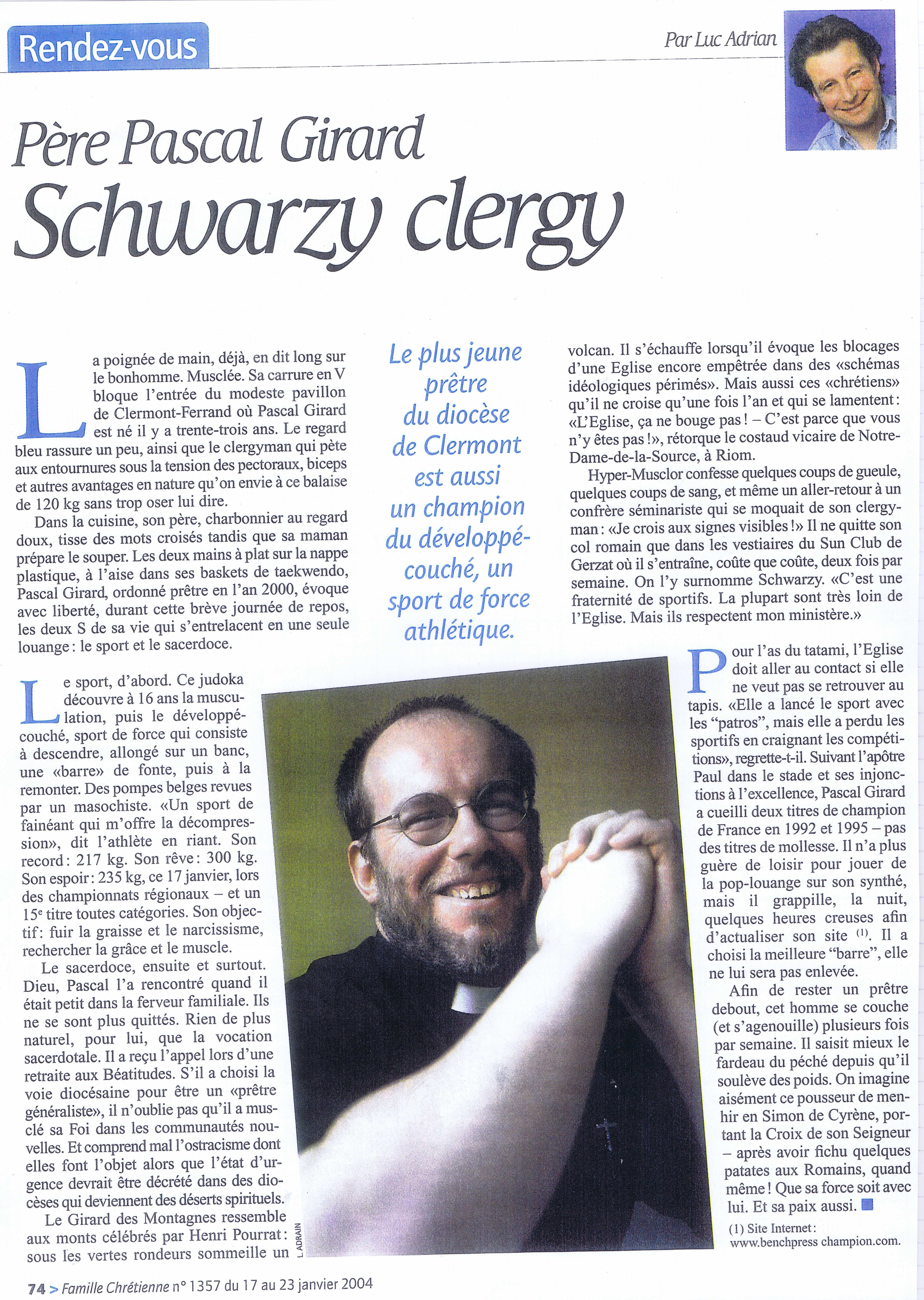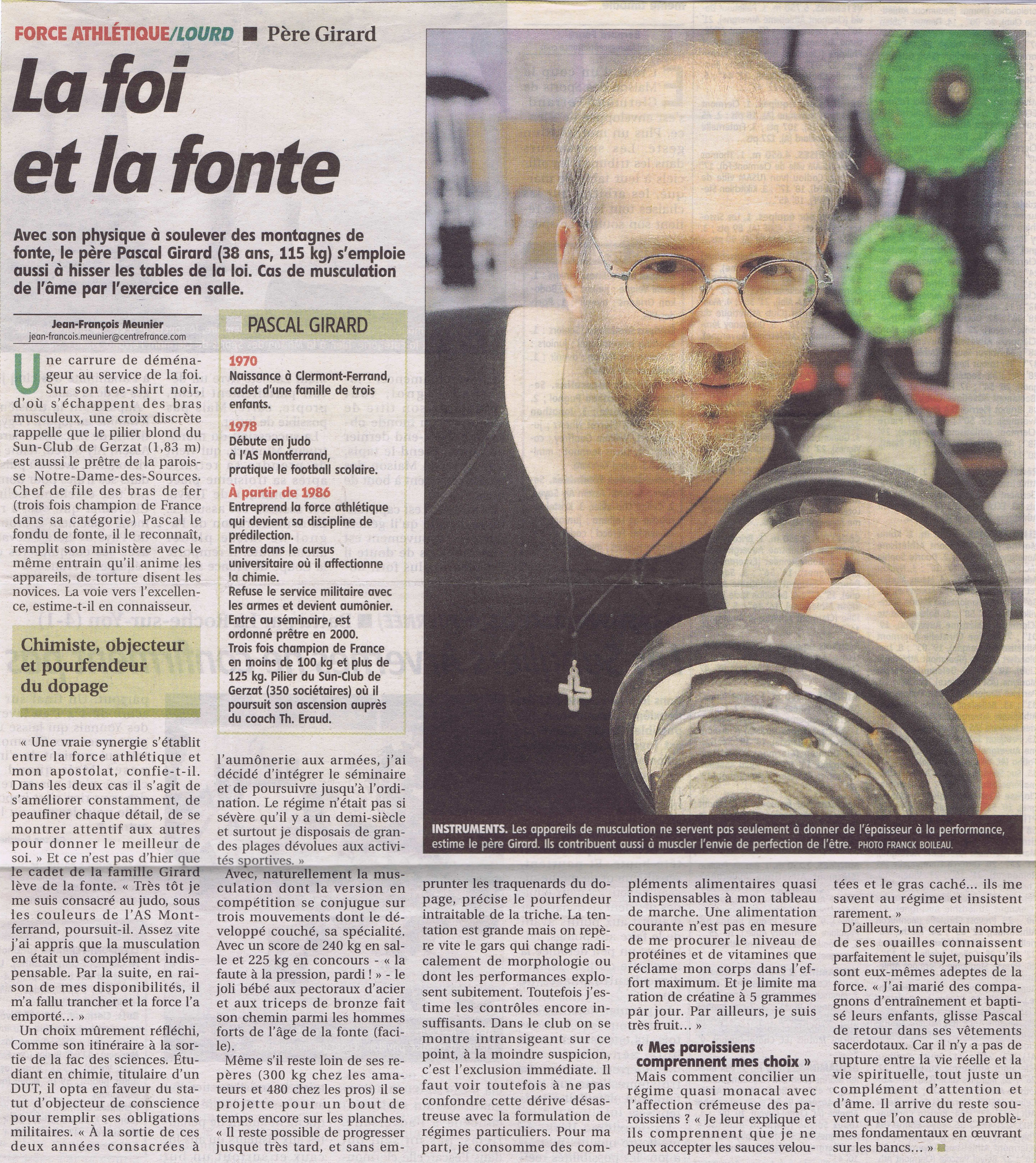 Une exposition des grands sportifs et évènements de Riom : 27 Juin 2024 RIOM, TERRE DE JEUX ! : article - vidéo Une exposition avec les portraits dans la ville de champions riomois dont le père Pascal Girard ... Nouvel article sur un site internet ... CLERMONT-FERRAND : LA FORCE ET L'ESPRIT DES JEUX Site internet de la conférence des évêques de France du 15 Février 2024 ! Article de Florence de Maistre dans le cadres des Jeux de Paris 2024 ... Nouvel article sur un site internet ... DES CHANSONS POUR TRANSFORMER L'ESSAI Sur le site d'au cabaret du bon Dieu du 12 Février 2024 ! Réponse du père Pascal Girard au questionnaire de Robert Migliorini ... Membre de l'équipe de rédaction d'un livre ... EGLISE ET SPORT Numéro de la revue "Documents Episcopat" ... Mai 2022 ! Equipe de rédaction : Alain Paillard, Gilles Lecocq, père Pascal Girard et Pascal Balmand ... Couverture et article dans l'hebdomadaire du Semeur Hebdo : ... PASCAL GIRARD : PRETRE ET SPORTIF Journal : LE SEMEUR HEBDO, Rubrique : l'invité ... 13 Mai 2016 ! Mohammed Afiri, journaliste du Semeur m'interviewe sur mon parcours ... Reportage photos sur les prêtres et le sport : ... PRETRES ET SPORTIFS Site internet : dominiquedelpoux.fr/pretres-sportifs ... Juin 2014 ! Le photographe Dominique Delpoux me recontre pour faire un portrait photos du sportif et du prêtre ... Nouvel article d'un hebdomadaire chrétien : ... LE SPORT, TERRAIN D'EVANGELISATION POUR L'EGLISE Journal : LA CROIX : rubrique : religion ... 2 Mai 2013 ! Page de présentation et d'interview de Bruno Bouvet sur le congrès national de la Pastorale du sport ... Couverture et article dans l'hebdomadaire du Semeur Hebdo : ... PASCAL GIRARD, L'ATHLETE DE DIEU Journal : LE SEMEUR HEBDO, rubrique : L'invité de la rédaction ... 27 Février 2009 ! Jean-Baptiste Botella, journaliste du Semeur m'interviewe sur le sport et la foi ... Nouveaux articles de La Montagne, Pascal Girard et la Force Athlétique : ... LA FOI ET LA FORCE Journal : LA MONTAGNE, rubrique : Sport ... 30 Novembre 2008 ! Un journaliste et son photographe viennent faire découvrir notre discipline au Sun Club ... AIDE LA PUISSANCE A MONTER EN TOI Journal : LA MONTAGNE, rubrique : Alternative Sport ... 10 Décembre 2008 ! Article rédigé pour la revue Prêtres Diocésains PASTORALE DU SPORT : TERRAIN D'EVANGELISATION Revue : Prêtres Diocésains ... rubrique : Ministère et vie des prêtres : Novembre 2008 ! Article de réflexion que le père Pascal Girard a écrit pour parler d'Evangélisation par le sport ... Deuxième article d'un hebdomadaire chrétien ... NOURRIR SON AME SANS NEGLIGER SON CORPS Journal : LA CROIX, rubrique : Portrait ... 3 Septembre 2007 ! Article de Géraldine Houot sur le prêtre responsable de la pastorale du sport ... Grand reportage dans un mensuel sportif : ... MON CURE CHEZ LES CULTURISTES ! Journal : Sports Auvergne n°8 ... Mars-Avril 2007 ! Reportage de la revue Sports Auvergne : photos de Ludovic Combe, article de Frédéric Vernou ... Un article dans un journal de l'est ... PASCAL GIRARD, LA FOI DANS LA FORCE ATHLETIQUE ! Journal : Le républicain lorrain ... 5 Mai 2006 ! A l'occasion des championnats d'Europe GPC à Saint Avold où je suis venu prendre des photos ... Une interview du journaliste Bernard Mathis sur un curé insolite ! Premier article dans un quotidien sportif : ... RIOM, AU FIL DES TEMPS : PERE PASCAL GIRARD ! Journal : L'Equipe Magazine, rubrique : une ville, un champion ... 22 Avril 2006 ! Le rédacteur en chef de l'équipe magazine contacte le père Pascal Girard pour rédiger un article ... Un article de fin d'année : ... PERE PASCAL GIRARD : L'ATHLETE DE DIEU ... ! Journal : Riom Cité Magazine ... Décembre 2005 ! Le journal de Riom et des environs distribué dans toutes les boites gratuitement me contacte ... Une interview vérité avec le questionnaire de Proust ! Première Interview pour un site internet : ... (BIBLE)²+(BICEPS)²+MP3 = PPG Site Internet : club.acsv.9online.fr ... 24 Novembre 2004 ! Par Bernard Vincent, webmaster du site internet de Force du club de Saint Vallier ... Premier article d'un hebdomadaire chrétien, rencontre avec Luc Adrian : ... PERE PASCAL GIRARD : SCHWARZY CLERGY Journal : FAMILLE CHRETIENNE, rubrique : Rendez-vous ... 17 Janvier 2004 ! Rencontre au mois d'Août pour parler sport et pastorale ... Nouvel article de La Montagne, le prêtre parle de son ministère : ... PRETRE ET SPORTIF A TEMPS PLEIN ! Journal : LA MONTAGNE, rubrique : Riom ... 29 Avril 2003 ! A quelques jours des championnats de France rencontre avec l'athlète ... Les articles de la rentrée : ... PERE GIRARD : LE CURE DES HALTERES ... ! Journal : LE POINT, numéro spécial 30 ans ... 13 Septembre 2002 ! A la suite de la campagne du conseil général, le portrait du père Girard a séduit ... il a été choisi pour être parmi 30 personnalités pour fêter les 30 ans ... Les articles de la rentrée : ... MON CURE CHEZ LES CULTURISTES ... ! Journal : INFO ... 20 Août 2002 ! Le journal du Puy de Dôme distribué dans toutes les boites gratuitement me contacte ... l'aspect prêtre et compétiteur intéresse toujours les journaux ! Une campagne d'année du Conseil Général : ... 40 PERSONNALITES QUI FONT PARLER DU PUY DE DOME ! Journal de voeux du Conseil Général ... Janvier 2002 ! 40 personnes du département souhaitent la bonne année aux habitants ... une campagne pour redonner une image dynamique du Puy-de-Dôme avec des passionnés ... Nouvel article de La Montagne, le séminariste est devenu prêtre : ... PASCAL GIRARD, PRETRE ET ATHLETE ! Journal : LA MONTAGNE, rubrique : actualité ... 21 Septembre 2001 ! un journaliste veut mettre en valeur le fait d'être prêtre et compétiteur ... Un article de journal pour annoncer mon ordination UN CHAMPION DE FORCE ORDONNE PRETRE Journal : LA MONTAGNE, rubrique : actualité ... 23 Juin 2000 ! un article qui présente Pascal Girard à la fois sportif et homme d'Eglise ... La premi