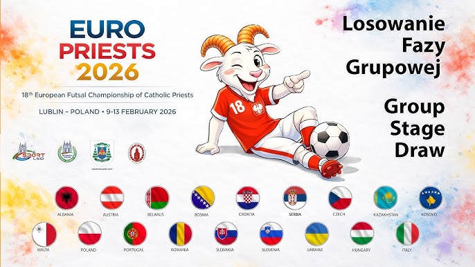 UN TOURNOI DE FOOTBALL EN SALLE ENTRE LES PRETRES 01° CHAMPIONNAT D'EUROPE à Eisenstadt en Autriche 18 Janvier 2003 1° Croatie, 2° Pologne, 3° Autriche, 4° Slovénie, 5° Bosnie-Herzegovine, 6° Hongrie, 7° Slovaquie. 02° CHAMPIONNAT D'EUROPE à Zagreb en Croatie .............. 2005 1° Croatie, 2° Pologne, 3° Bosnie-Herzegovine, 4° Portugal, 5° Hongrie, 6° Slovaquie, 7° Slovénie, 8° Italie, 9° Espagne, 10° .........., 11° Roumanie, 12° Autriche . 03° CHAMPIONNAT D'EUROPE à Sarajevo en Bosnie-Herzegovine 12-14 Février 2007 1° Pologne, 2° Croatie, 3° Bosnie-Herzegovine, 4° Portugal, 5° Espagne, 6° Slovénie, 7° Autriche, 8° Italie, 9° Hongrie, 10° Roumanie 04° CHAMPIONNAT D'EUROPE à Braga au Portugal 21-24 Février 2009 1° Pologne, 2° Portugal, 3° Croatie, 4° Bosnie-Herzegovine, 5° Espagne, 6° Italie, 7° Slovaquie, 8° Autriche, 9° Hongrie, 10° Slovénie, 11° Biélorussie 05° CHAMPIONNAT D'EUROPE à Kielce en Pologne 21-25 Février 2011 1° Pologne, 2° Croatie, 3° Portugal, 4° Bosnie-Herzegovine, 5° Hongrie, 6° Slovénie, 7° Autriche, 8° Biélorussie, 9° Espagne, 10° Ukraine 06° CHAMPIONNAT D'EUROPE à Gyula en Hongrie / Compte-rendu 7-11 Février 2012 1° Portugal, 2° Croatie, 3° Pologne, 4° Bosnie-Herzegovine, 5° Hongrie, 6° Slovaquie, 7° Slovénie, 8° Roumanie, 9° Biélorussie, 10° Autriche, 11° Ukraine 07° CHAMPIONNAT D'EUROPE à Celje et Zalec en Slovénie 25 Février-1° Mars 2013 1° Pologne, 2° Bosnie-Herzegovine, 3° Slovaquie, 4° Croatie, 5° Portugal, 6° Roumanie, 7° Hongrie, 8° Biélorussie, 9° Autriche, 10° Slovénie, 11° Italie, 12° Ukraine, 13° Montenegro 08° CHAMPIONNAT D'EUROPE à Lida en Biélorussie 24-28 Février 2014 1° Pologne, 2° Croatie, 3° Portugal, 4° Biélorussie, 12° Autriche Albanie, Hongrie, Kazakhstan, Montenegro, Roumanie, Slovaquie, Slovenie, Ukraine, 09° CHAMPIONNAT D'EUROPE à St Polten au Autriche / Compte-rendu 23-27 Février 2015 1° Portugal, 2° Pologne, 3° Bosnie-Herzegovine, 4° Croatie, 5° Slovaquie, 6° Hongrie, 7° Roumanie, 8° Montenegro, 9° Ukraine, 10° Biélorussie, 11° Slovénie, 12° Italie, 13° Autriche, 14° Kazakhstan, 15° Albanie, 16° Allemagne. 10° CHAMPIONNAT D'EUROPE à Michalovce en Slovaquie 1°-4 Février 2016 1° Portugal, 2° Pologne, 3° Croatie, 4° Bosnie-Herzegovine, 5° Hongrie, 6° Biélorussie, 7° Slovaquie, 8° Ukraine, 9° Roumanie, 10° Autriche, 11° Italie, 12° Montenegro, 13° République Tchèque, 14° Kazakhstan 11° CHAMPIONNAT D'EUROPE à Vukovar en Croatie 21-23 Février 2017 1° Portugal, 2° Bosnie-Herzégovine, ..... Italie, Croatie, Hongrie, République Tchèque, 12° CHAMPIONNAT D'EUROPE à Brescia en Italie / Affiche / Compte-rendu 8-11 Février 2018 1° Pologne, 2° Portugal, 3° Slovaquie 4° Hongrie, 5° Bosnie-Herzégovine, 6° Autriche, 7° Croatie, 8° Roumanie, 9° Italie, 10° Biélorussie, 11° Albanie, 12° Slovénie, 13° République Tchèque, 14° Kazakhstan, 15° Ukraine, 16° Montenegro 13° CHAMPIONNAT D'EUROPE à Bar et Ulvcinj en Croatie 25 Février au 1° Mars 2019 1° ....., 5° Slovaquie, 6° Roumanie, 7° Kosovo, 8° Hongrie, 13° Italie, 14° Slovénie, République Tchèque, Pologne, Croatie, Ukraine, Portugal, Bosnie-Herzgovine, Biélorussie, Autriche, Albanie, Serbie 14° CHAMPIONNAT D'EUROPE à Prague en République Tchèque / Compte-rendu 17-21 Février 2020 1° Pologne, 2° Bosnie Herzegovine, 3° Portugal, 4° Slovaquie, 9° Croatie, 10° République Tchèque Kazakhstan, Serbie, Albanie, Monténégro, Ukraine, Italie, Autriche, Slovénie, Biélorussie, Kosovo, Hongrie, Roumanie 15° CHAMPIONNAT D'EUROPE à Timisoara en Roumanie / Compte-rendu 13-16 Février 2023 1° Pologne, 2° Portugal, 3° Bosnie-Herzégovine, 4° Slovaquie, 5° Croatie, 6° Roumanie, 7° Hongrie, 8° Kosovo, 9° Slovenie, 10° Autriche, 11° Italie, 12° Kazakhstan, 13° Abanie, 14° République Tchèque, 15° Serbie, 16° Monténégro, 16° CHAMPIONNAT D'EUROPE à Skadar en Albanie / Compte-rendu / article 5-9 Février 2024 1° Croatie, 2° Pologne, 3° Bosnie-Herzégovine, 4° Roumanie 17° CHAMPIONNAT D'EUROPE à Kisvarda en Hongrie / Compte-rendu / Vidéo (récompenses) 10-14 Février 2025 1° Pologne, 2° Slovaquie, 3° Croatie, 4° Hongrie, 5° .................., 6° Roumanie, 9° Italie, 10° Kosovo Albanie, Autriche, Bosnie-Herzegovine, République Tchèque,Kazakhstan, Monténégro, Portugal, Serbie 18° CHAMPIONNAT D'EUROPE à Lublin en Pologne / Compte-rendu / affiche 9-13 Février. 2026 1° Pologne, 2° Croatie, 3° Portugal, 4° Bosnie-Herzégovine, 5° Hongrie, 6° Roumanie, 7° Slovaquie, 8° Biélorussie, 9° République Tchèque, 10° Slovénie, 11° Ukraine, 12° Hongrie, 13° Italie, 14° Autriche, 15° Kazakhstan, 16° Malte, 17° Kosovo, 18° Albanie |