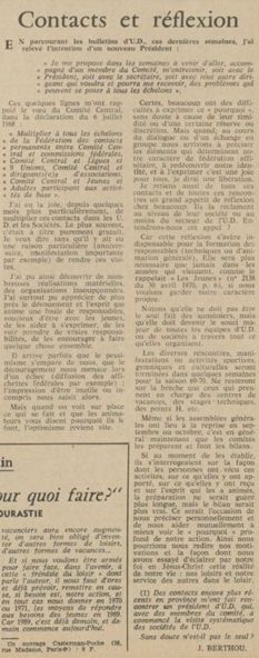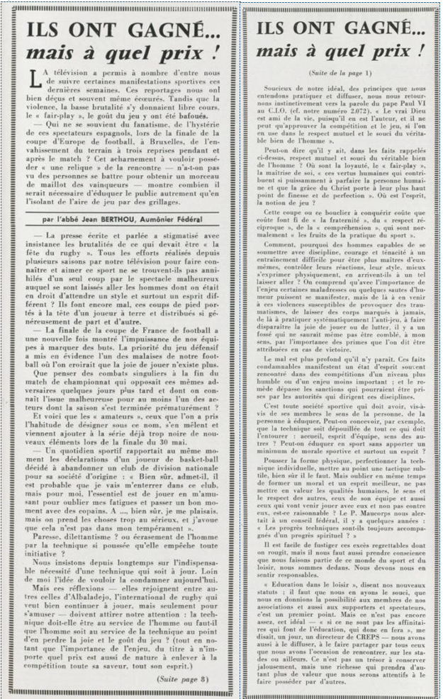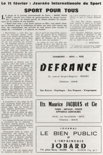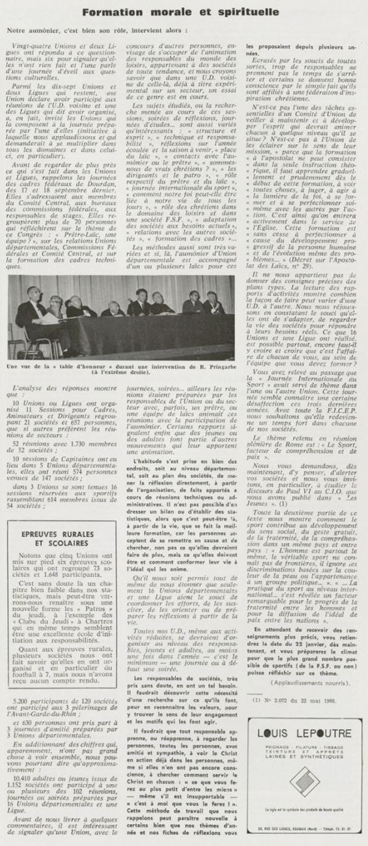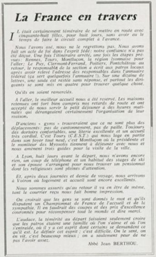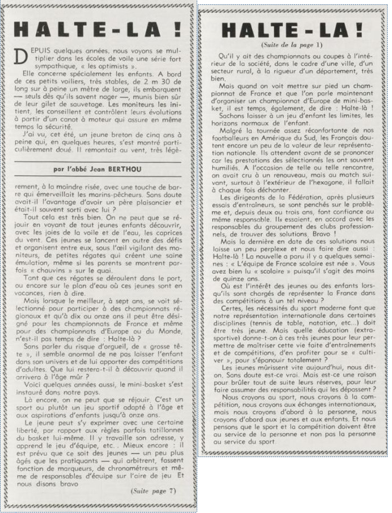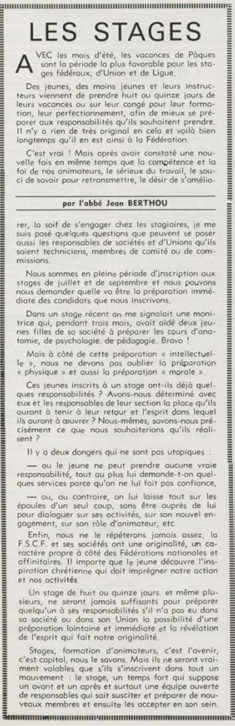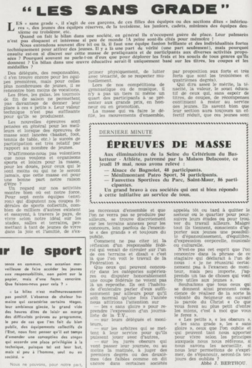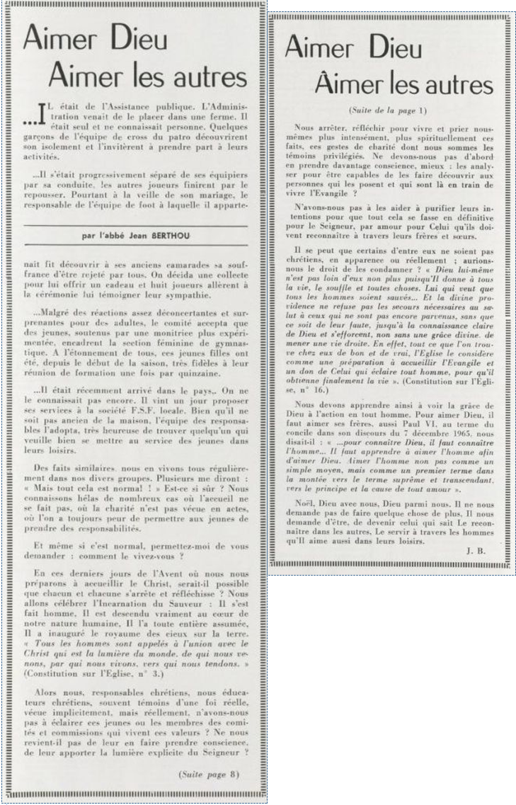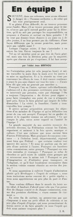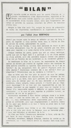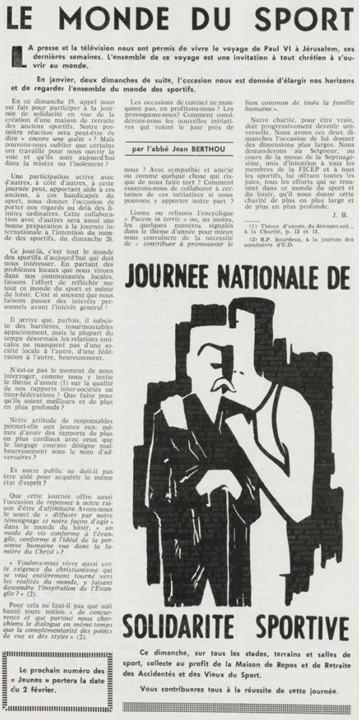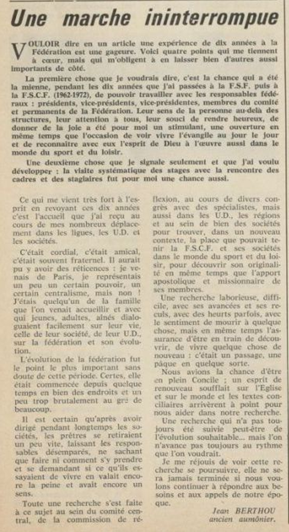 père Jean Berthou, aumônier de la FSF puis de la FSCF ... Jean Berthou, né à Brest le 20 juillet 1924 et ordonné le 3 août 1947 est un prêtre du diocèse de Quimper. Aumônier national de la Fédération sportive et culturelle de France (FSCF) de 1962 à 1972, il assure ensuite diverses responsabilités importantes dans son diocèse d'origine. BiographieAprès ses études, Jean Berthou est ordonné prêtre le 3 août 1947. Nommé d'abord professeur au collège Saint-Yves de Quimper, il est ensuite successivement vicaire à Landerneau (1948-1953) puis à Saint-Louis de Brest (1953-1962) où il se consacre particulièrement au patronage de l'Armoricaine de Brest pendant neuf ans. Il est ensuite appelé à l'aumônerie nationale de la Fédération sportive de France (FSF). Après cette mission nationale, il occupe des fonctions de premier plan au sein du diocèse de Quimper. Nommé pour son dernier poste à Plonévez-Porzay en 1996, il se retire au presbytère de cette paroisse en 2004 et décède le 27 octobre 2010 à Crozon. Ses obsèques ont lieu le 30 octobre 2010 à Crozon où il est inhumé. La Fédération sportive de FranceLa fonction de conseiller ecclésiastique auprès de la Fédération sportive de France (FSF) est créée en 1948 par l'Épiscopat. Avant la nomination de Jean Berthou, le 1er octobre 1962, deux autres religieux l'ont précédé : le chanoine Jean Wolff de 1948 à 1958 et le R.P. jésuite Alain Maucorps de 1958 à 1962. Nommé d'abord à mi-temps, sa fonction est étendue à temps complet en septembre 1963. Ses prédécesseurs lui lèguent essentiellement un ensemble de fiches de réflexion à l’usage des laïcs. Afin d'affiner leur analyse Jean Berthou fait appel à un théologien : le père François Bourdeau. Homme de terrain avant tout, il s’astreint aussi à visiter chaque année les Centres régionaux d’éducation physique et sportive (CREPS) de France où se tiennent la plus grande partie des stages fédéraux. Il devient le principal représentant itinérant de l'autorité fédérale auprès des cadres, des stagiaires et de l'administration des CREPS. Sa voiture le conduit chaque année de Strasbourg à Aix-en-Provence en passant par Dinard, Poitiers et Bordeaux ; avec parfois des détours par Dijon, Wattignies, Châtel-Guyon ou Montpellier. Après l'élargissement de la FSF à la culture et aux centres de vacances lors de son changement de sigle pour celui de Fédération sportive et culturelle de France (FSCF), le 13 mars 1968, cette tâche qu'il s'impose se trouve encore considérablement accrue. Il