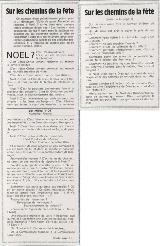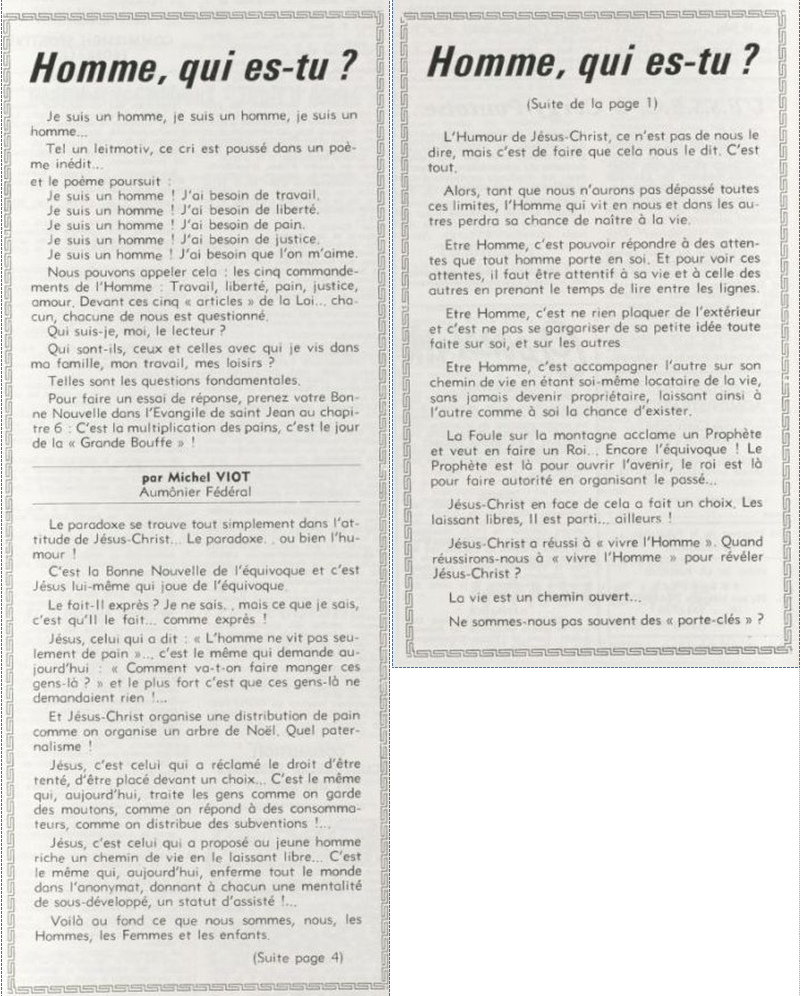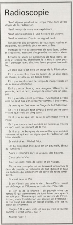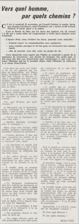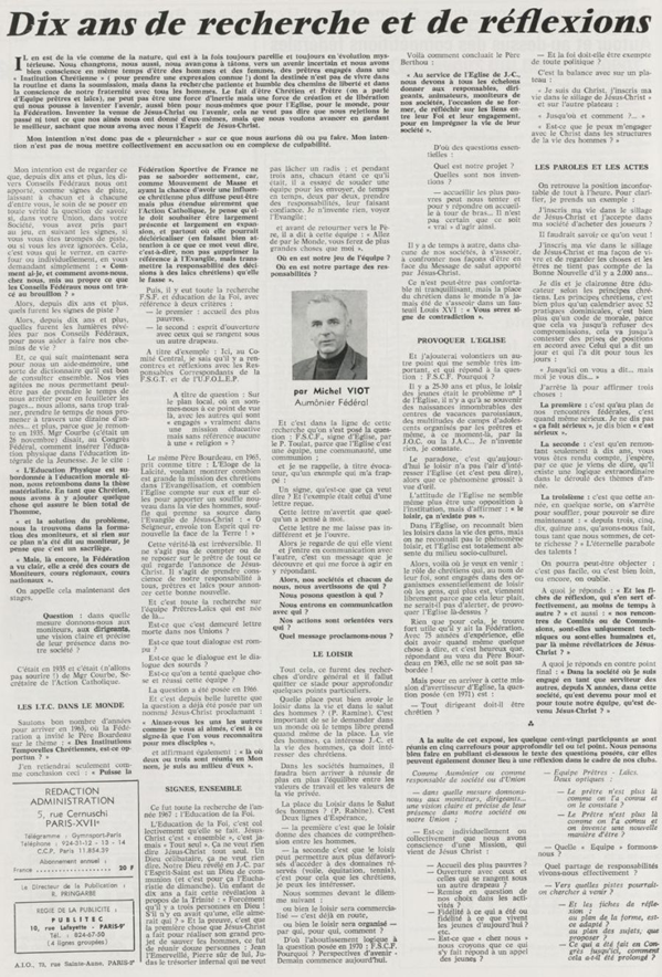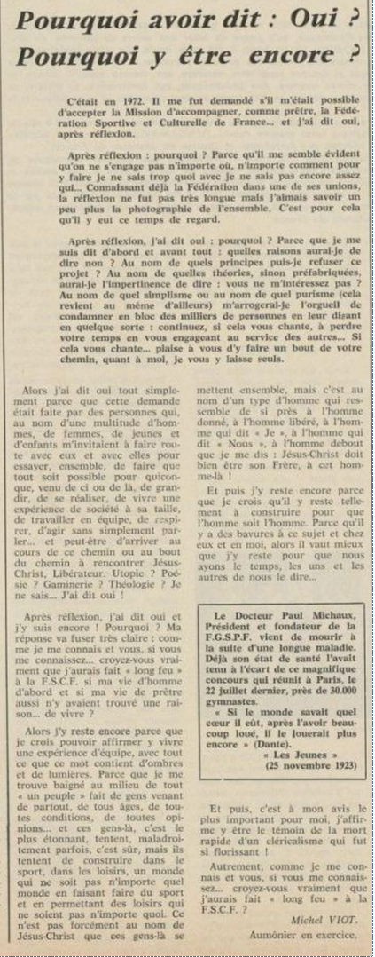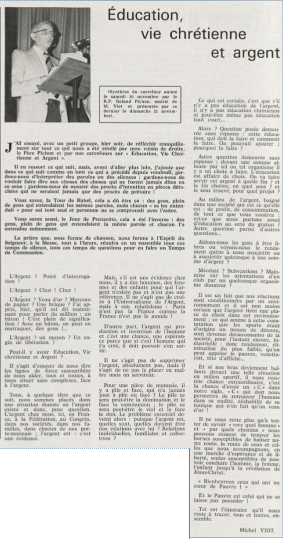 père Michel Viot, aumônier de la FSCF ... Michel, Antoine, Marie, Charles Viot, né le 24 novembre 1924 à Nantes, est un prêtre catholique du diocèse de Nantes, aumônier de mouvements et associations, directeur de revues. BiographieMichel Viot né le 24 Novembre 1924 à Nantes est le fils de Henri Viot et de Françoise René Bazin. Par sa mère il est petit fils de l’écrivain Hervé Bazin. Service pastoral et enseignantOrdonné prêtre le 10 Septembre 1950, il est nommé vicaire instituteur au Pallet d'octobre 1950 à octobre 1952 puis professeur de sixième au Lycée Externat des Enfants Nantais. Le 8 Octobre 1960, il est curé de la paroisse Saint Félix et le 14 septembre 1968 de Saint Clément jusqu'en 1970. Aumônerie des œuvresDepuis 1968, il est aussi aumônier diocésain du service Sports, Loisirs et Culture et des Scouts et Guides de France. De 1972 à 1978 il est mis à temps partiel au service de la Fédération sportive et culturelle de France (FSCF) comme conseiller ecclésiastique national. Il marque les esprits pour être le premier à abandonner la soutane au profit d'un clergyman très strict et poursuit le travail de Jean Berthou au niveau de la visite des stages et s'investit dans le groupe de réflexion sur l'identité fédérale qui aboutit après son départ à la publication du document fédéral fondamental (DFF). Le bulletin fédéral les Jeunes doit aussi certaines de ses colonnes à sa plume alerte. Pendant ce temps il demeure aumônier diocésain des Scouts et Guides de France et du Service Sport, Loisirs et Culture. Responsabilités diocésainesDe 1979 à 1982, directeur de l'Écho de l'Ouest, délégué à la communication et porte-parole de l'évêché, il assure le lien avec les médias ; il reste pendant ce temps aumônier des élèves catholiques du lycée Aristide Briand. Le 15 septembre 1982 il prend sa retraite à Nantes, mais ne renonce à sa responsabilité d'aumônier diocésain du comité départemental de Loire-Atlantique de la FSCF qu'en 1991, remplacé par Jean-Yves Saunier. Il meurt le 25 Juin 2007 au matin, ses obsèques ont lieu le jeudi 28 juin 2007 en l'église Saint Donatien de Nantes où l'homélie est prononcée par son successeur, Jean-Yves Saunier. sources : FSCF, WikipédiaMot dans la revue Les Jeunes 1970 : A quoi ça sert Mot dans la revue Les Jeunes 1970 : Avez-vous la clé Mot dans la revue Les Jeunes 1972 : Vision d'espoir Mot dans la revue Les Jeunes 1972 : Qui sera au rendez-vous Mot dans la revue Les Jeunes 1972 : Dialogue à la frontière du possible Mot dans la revue Les Jeunes 1972 : Dix ans de recherche et de réflexion Mot dans la revue Les Jeunes 1973 : Sur les chemins de la fête Mot dans la revue Les Jeunes 1973 : Voici l'homme Mot dans la revue Les Jeunes 1973 : Attention cet homme est dangereux Mot dans la revue Les Jeunes 1973 : Un peuple se construit Mot dans la revue Les Jeunes 1973 : Homme qui es-tu Mot dans la revue Les Jeunes 1973 : Chez nous Mot dans la revue Les Jeunes 1974 : Vers quel homme, par quels chemins Mot dans la revue Les Jeunes 1974 : Pouce, je ne joue plus Mot dans la revue Les Jeunes 1974 : Isolés par rapport à l'Eglise Mot dans la revue Les Jeunes 1974 : Qu'est ce que j'ai dans ma p'tite tête Mot dans la revue Les Jeunes 1974 : Vers quel homme, par quels chemins Mot dans la revue Les Jeunes 1974 : Photocopie ou création Mot dans la revue Les Jeunes 1974 : C'est le temps de la Pâque Mot dans la revue Les Jeunes 1974 : Il pleuvait sur la ville, mais qu'importe Mot dans la revue Les Jeunes 1974 : Litanie des farfelus Mot dans la revue Les Jeunes 1974 : Radioscopie Mot dans la revue Les Jeunes 1974 : Un trou dans le mur Mot dans la revue Les Jeunes 1975 : Une, deux, une, deux Mot dans la revue Les Jeunes 1975 : Quelle envolée Mot dans la revue Les Jeunes 1975 : Le temps de l'espérance Mot dans la revue Les Jeunes 1975 : Bénévole ? A d'autres Mot dans la revue Les Jeunes 1976 : A la fin de l'envoi je touche Mot dans la revue Les Jeunes 1976 : Est-ce qu'il y reste une place à Jésus Christ à la FSCF Mot dans la revue Les Jeunes 1976 : Respect de la vie Mot dans la revue Les Jeunes 1976 : Epinal, Troyes, Montredon, Paris Mot dans la revue Les Jeunes 1976 : Radioscopie Mot dans la revue Les Jeunes 1976 : Ephémérides Mot dans la revue Les Jeunes 1976 : Aveugle de naissance Mot dans la revue Les Jeunes 1976 : Education, vie chrétienne et argent Mot dans la revue Les Jeunes 1977 : Ben mon gaillard Mot dans la revue Les Jeunes 1977 : Merci Gérard Mot dans la revue Les Jeunes 1977 : Il nous envoie sur les pâquerettes Mot dans la revue Les Jeunes 1977 : Lettre ouverte de Jean-Pierre à son dirigeant Mot dans la revue Les Jeunes 1977 : Les petites annonces Mot dans la revue Les Jeunes 1977 : La vie des unions Mot dans la revue Les Jeunes 1977 : Au delà de l'atroce Mot dans la revue Les Jeunes 1977 : A lire dangereusement Mot dans la revue Les Jeunes 1978 : Liberté Mot dans la revue Les Jeunes 1978 : Par la lucarne Mot dans la revue Les Jeunes 1978 : Hommages Mot dans la revue Les Jeunes 1978 : De Paul VI à Jean-Paul 1° Mot dans la revue Les Jeunes 1978 : Pourquoi avoir dit oui Mot dans la revue Les Jeunes 1978 : Peut-on annoncer Jésus Christ sur les stades aujourd'hui Mot dans la revue Les Jeunes 1979 : L'avenir est à l'espérance Mot dans la revue Les Jeunes 1979 : Que veut-on de mes frères et de moi-même Mot dans la revue Les Jeunes 1979 : Les quatre aveugles Mot dans la revue Les Jeunes 1979 : Au fil de la route Mot dans la revue Les Jeunes 1979 : Prendre un enfant par la main Mot dans la revue Les Jeunes 1979 : Conte pour vivre Mot dans la revue Les Jeunes 1979 : Ce fut ce que ce fut Au revoir du président à l'aumônier national en 1979 |