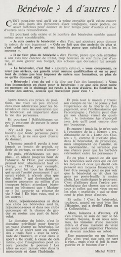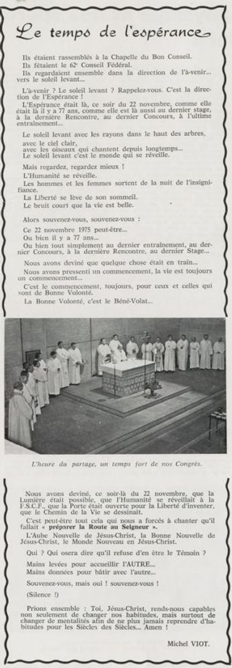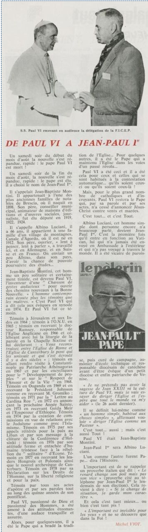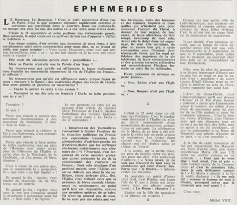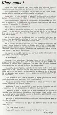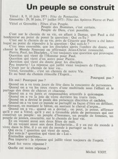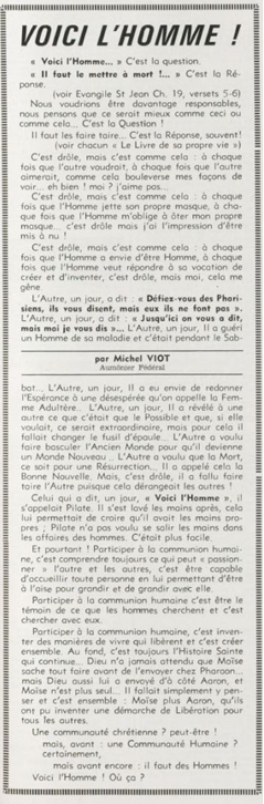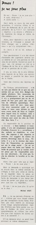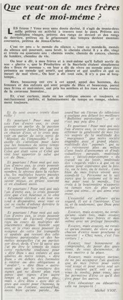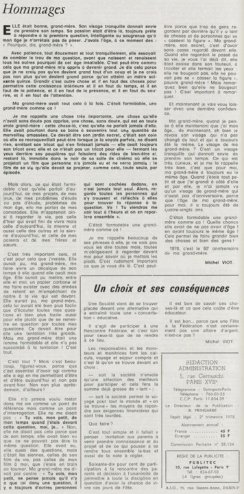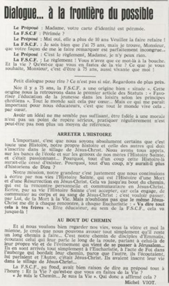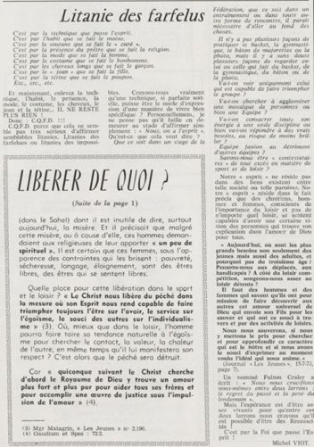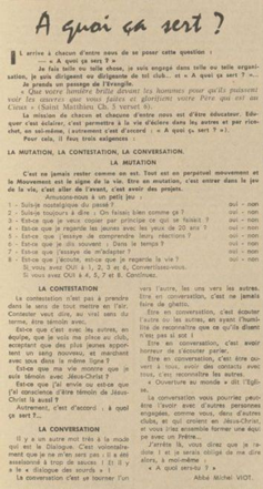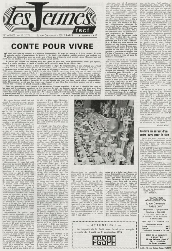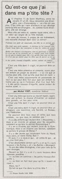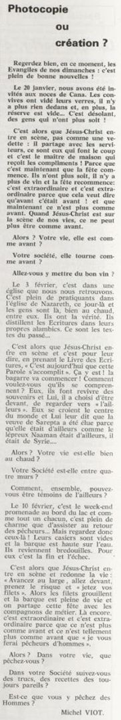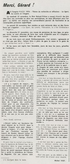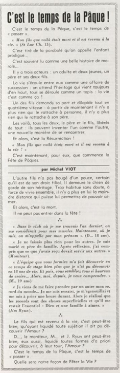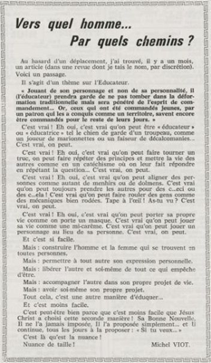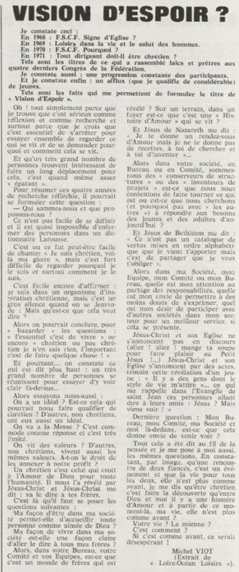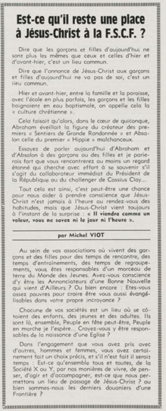 père Michel Viot, aumônier de la FSCF ... Michel, Antoine, Marie, Charles Viot, né le 24 novembre 1924 à Nantes, est un prêtre catholique du diocèse de Nantes, aumônier de mouvements et associations, directeur de revues. BiographieMichel Viot né le 24 Novembre 1924 à Nantes est le fils de Henri Viot et de Françoise René Bazin. Par sa mère il est petit fils de l’écrivain Hervé Bazin. Service pastoral et enseignantOrdonné prêtre le 10 Septembre 1950, il est nommé vicaire instituteur au Pallet d'octobre 1950 à octobre 1952 puis professeur de sixième au Lycée Externat des Enfants Nantais. Le 8 Octobre 1960, il est curé de la paroisse Saint Félix et le 14 septembre 1968 de Saint Clément jusqu'en 1970. Aumônerie des œuvresDepuis 1968, il est aussi aumônier diocésain du service Sports, Loisirs et Culture et des Scouts et Guides de France. De 1972 à 1978 il est mis à temps partiel au service de la Fédération sportive et culturelle de France (FSCF) comme conseiller ecclésiastique national. Il marque les esprits pour être le premier à abandonner la soutane au profit d'un clergyman très strict et poursuit le travail de Jean Berthou au niveau de la visite des stages et s'investit dans le groupe de réflexion sur l'identité fédérale qui aboutit après son départ à la publication du document fédéral fondamental (DFF). Le bulletin fédéral les Jeunes doit aussi certaines de ses colonnes à sa plume alerte. Pendant ce temps il demeure aumônier diocésain des Scouts et Guides de France et du Service Sport, Loisirs et Culture. Responsabilités diocésainesDe 1979 à 1982, directeur de l'Écho de l'Ouest, délégué à la communication et porte-parole de l'évêché, il assure le lien avec les médias ; il reste pendant ce temps aumônier des élèves catholiques du lycée Aristide Briand. Le 15 septembre 1982 il prend sa retraite à Nantes, mais ne renonce à sa responsabilité d'aumônier diocésain du comité départemental de Loire-Atlantique de la FSCF qu'en 1991, remplacé par Jean-Yves Saunier. Il meurt le 25 Juin 2007 au matin, ses obsèques ont lieu le jeudi 28 juin 2007 en l'église Saint Donatien de Nantes où l'homélie est prononcée par son successeur, Jean-Yves Saunier. sources : FSCF, WikipédiaMot dans la revue Les Jeunes 1970 : A quoi ça sert Mot dans la revue Les Jeunes 1970 : Avez-vous la clé Mot dans la revue Les Jeunes 1972 : Vision d'espoir Mot dans la revue Les Jeunes 1972 : Qui sera au rendez-vous Mot dans la revue Les Jeunes 1972 : Dialogue à la frontière du possible Mot dans la revue Les Jeunes 1972 : Dix ans de recherche et de réflexion Mot dans la revue Les Jeunes 1973 : Sur les chemins de la fête Mot dans la revue Les Jeunes 1973 : Voici l'homme Mot dans la revue Les Jeunes 1973 : Attention cet homme est dangereux Mot dans la revue Les Jeunes 1973 : Un peuple se construit Mot dans la revue Les Jeunes 1973 : Homme qui es-tu Mot dans la revue Les Jeunes 1973 : Chez nous Mot dans la revue Les Jeunes 1974 : Vers quel homme, par quels chemins Mot dans la revue Les Jeunes 1974 : Pouce, je ne joue plus Mot dans la revue Les Jeunes 1974 : Isolés par rapport à l'Eglise Mot dans la revue Les Jeunes 1974 : Qu'est ce que j'ai dans ma p'tite tête Mot dans la revue Les Jeunes 1974 : Vers quel homme, par quels chemins Mot dans la revue Les Jeunes 1974 : Photocopie ou création Mot dans la revue Les Jeunes 1974 : C'est le temps de la Pâque Mot dans la revue Les Jeunes 1974 : Il pleuvait sur la ville, mais qu'importe Mot dans la revue Les Jeunes 1974 : Litanie des farfelus Mot dans la revue Les Jeunes 1974 : Radioscopie Mot dans la revue Les Jeunes 1974 : Un trou dans le mur Mot dans la revue Les Jeunes 1975 : Une, deux, une, deux Mot dans la revue Les Jeunes 1975 : Quelle envolée Mot dans la revue Les Jeunes 1975 : Le temps de l'espérance Mot dans la revue Les Jeunes 1975 : Bénévole ? A d'autres Mot dans la revue Les Jeunes 1976 : A la fin de l'envoi je touche Mot dans la revue Les Jeunes 1976 : Est-ce qu'il y reste une place à Jésus Christ à la FSCF Mot dans la revue Les Jeunes 1976 : Respect de la vie Mot dans la revue Les Jeunes 1976 : Epinal, Troyes, Montredon, Paris Mot dans la revue Les Jeunes 1976 : Radioscopie Mot dans la revue Les Jeunes 1976 : Ephémérides Mot dans la revue Les Jeunes 1976 : Aveugle de naissance Mot dans la revue Les Jeunes 1976 : Education, vie chrétienne et argent Mot dans la revue Les Jeunes 1977 : Ben mon gaillard Mot dans la revue Les Jeunes 1977 : Merci Gérard Mot dans la revue Les Jeunes 1977 : Il nous envoie sur les pâquerettes Mot dans la revue Les Jeunes 1977 : Lettre ouverte de Jean-Pierre à son dirigeant Mot dans la revue Les Jeunes 1977 : Les petites annonces Mot dans la revue Les Jeunes 1977 : La vie des unions Mot dans la revue Les Jeunes 1977 : Au delà de l'atroce Mot dans la revue Les Jeunes 1977 : A lire dangereusement Mot dans la revue Les Jeunes 1978 : Liberté Mot dans la revue Les Jeunes 1978 : Par la lucarne Mot dans la revue Les Jeunes 1978 : Hommages Mot dans la revue Les Jeunes 1978 : De Paul VI à Jean-Paul 1° Mot dans la revue Les Jeunes 1978 : Pourquoi avoir dit oui Mot dans la revue Les Jeunes 1978 : Peut-on annoncer Jésus Christ sur les stades aujourd'hui Mot dans la revue Les Jeunes 1979 : L'avenir est à l'espérance Mot dans la revue Les Jeunes 1979 : Que veut-on de mes frères et de moi-même Mot dans la revue Les Jeunes 1979 : Les quatre aveugles Mot dans la revue Les Jeunes 1979 : Au fil de la route Mot dans la revue Les Jeunes 1979 : Prendre un enfant par la main Mot dans la revue Les Jeunes 1979 : Conte pour vivre Mot dans la revue Les Jeunes 1979 : Ce fut ce que ce fut Au revoir du président à l'aumônier national en 1979 |